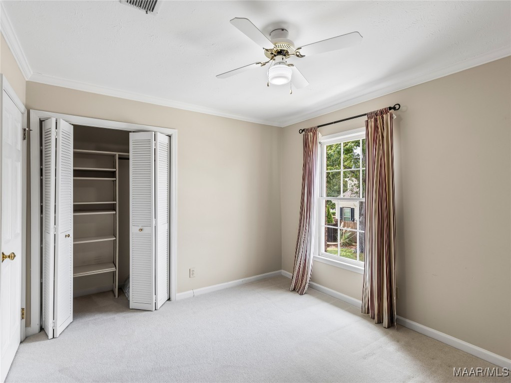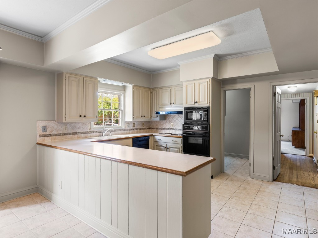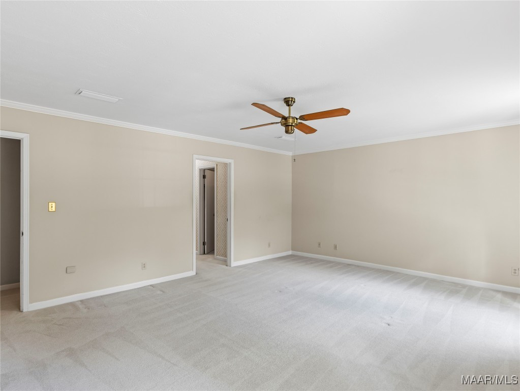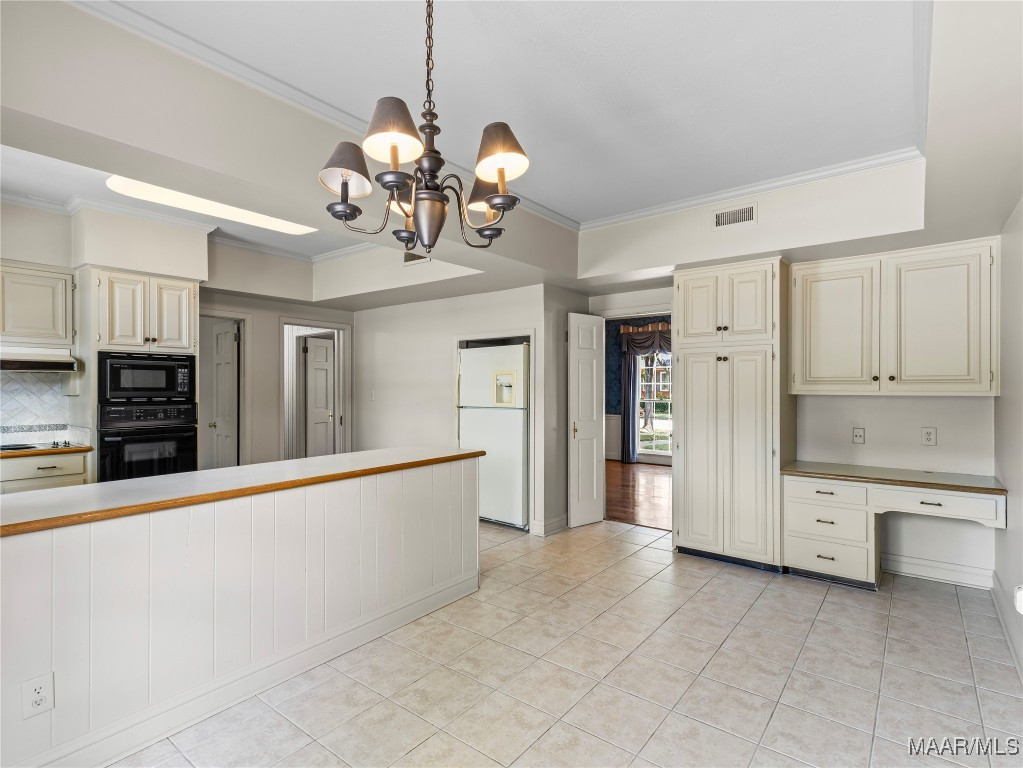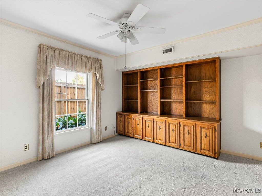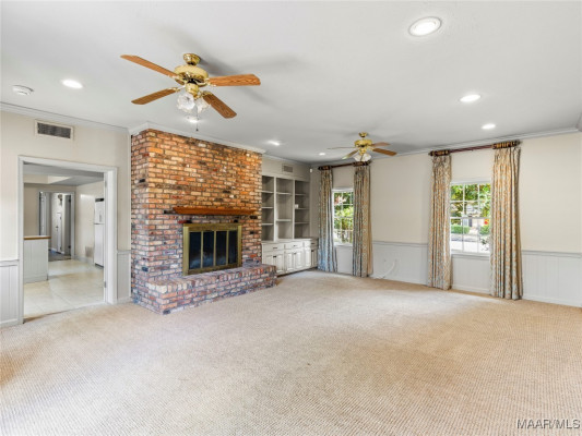 The heart of the home is the kitchen with a sunny breakfast area, flowing seamlessly into a spacious den featuring plush carpeting, a gas-log fireplace, and built-in shelving—perfect for relaxing evenings or game day gatherings.