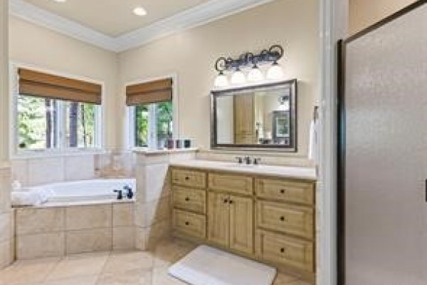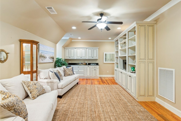 The CHEF’S DREAM KITCHEN is sure to impress even the most discerning culinary enthusiasts, boasting top-of-the-line appliances including two KitchenAid dishwashers, a Jenn Air electric cooktop, Jenn Air double ovens, and a KitchenAid ice machine. The built-in bar off the main kitchen adds a social element, perfect for hosting gatherings with friends and family.