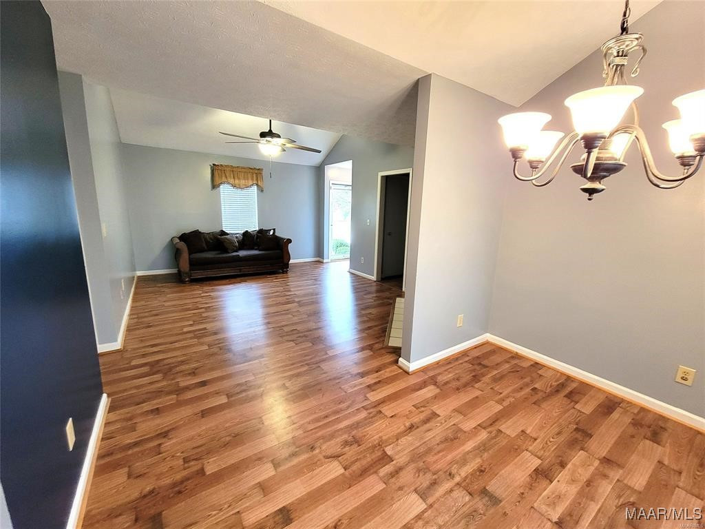 You’re going to love the laminate wood floors in this house that travel throughout the living spaces! Vaulted ceilings and an open concept make it large and easy to entertain. The sliding glass back door overlooks the back yard complete with lots of mature trees and storage shed. This is also a split floor plan with a large master suite.
