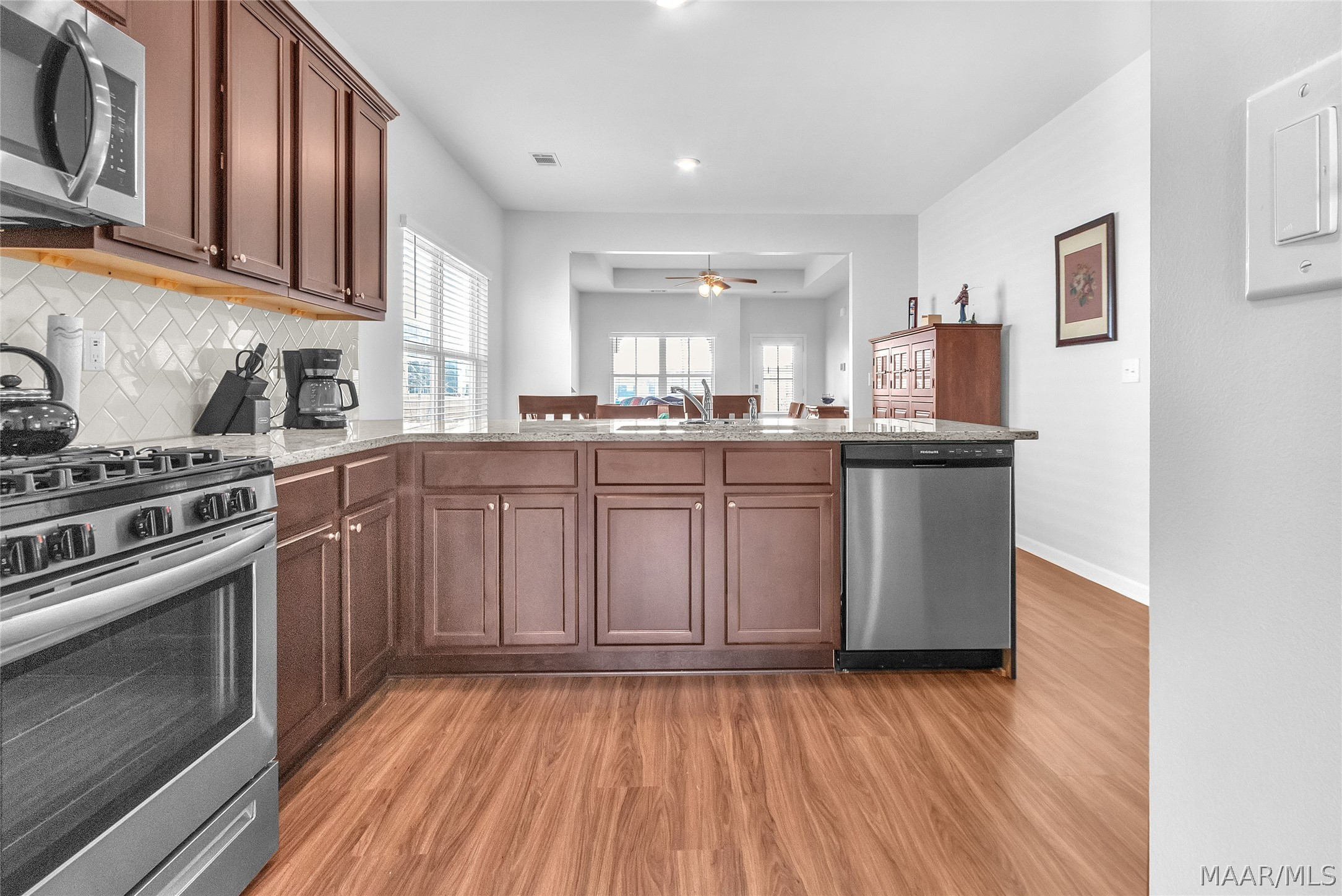 The living room welcomes you with a trey ceiling and opens seamlessly into the dining area and kitchen. The kitchen is designed for real life, featuring stainless gas appliances, generous cabinet and counter space, a pantry, and island seating, perfect for morning coffee, homework time, or hosting game night.