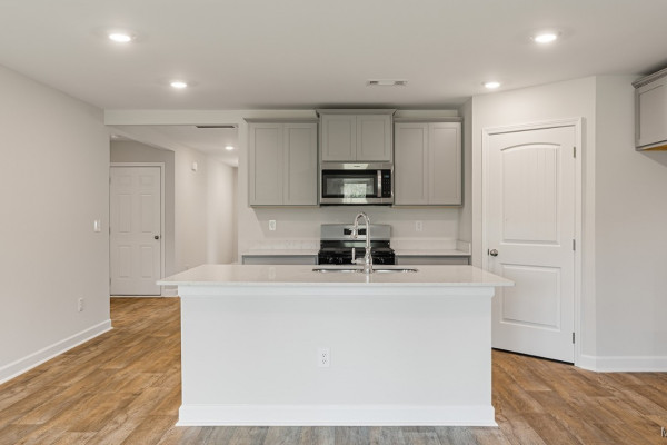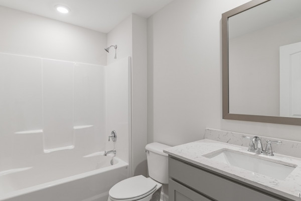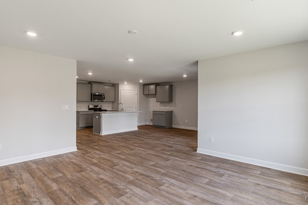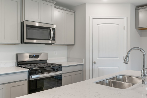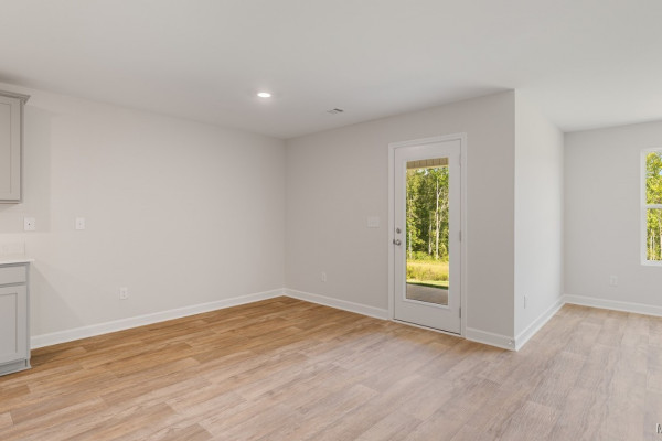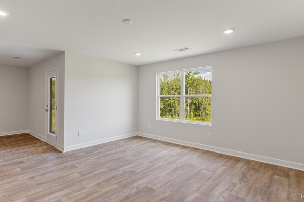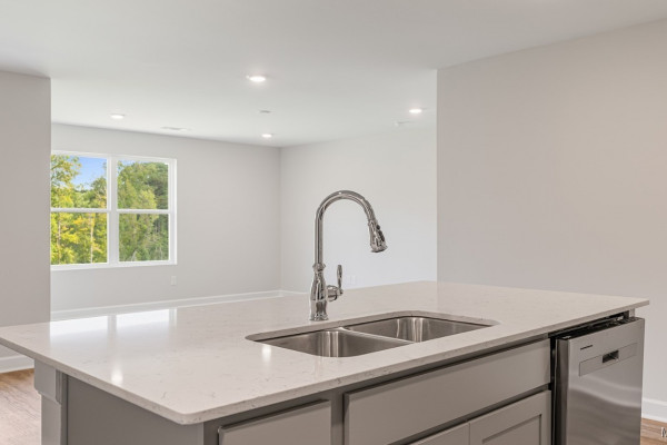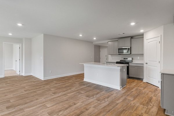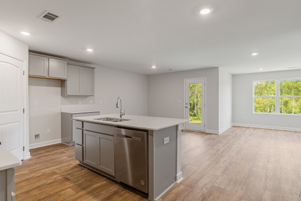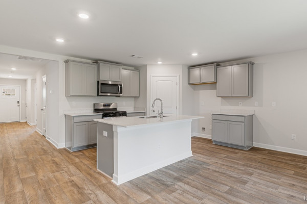 A standout feature is the seamless integration of the kitchen, dining area, and great room in an open concept layout, ideal for hosting guests. The kitchen has white shaker style cabinetry, quartz countertops, stainless steel appliances, and a corner pantry. The spacious living area includes trey ceilings and leads to a shaded covered porch.
