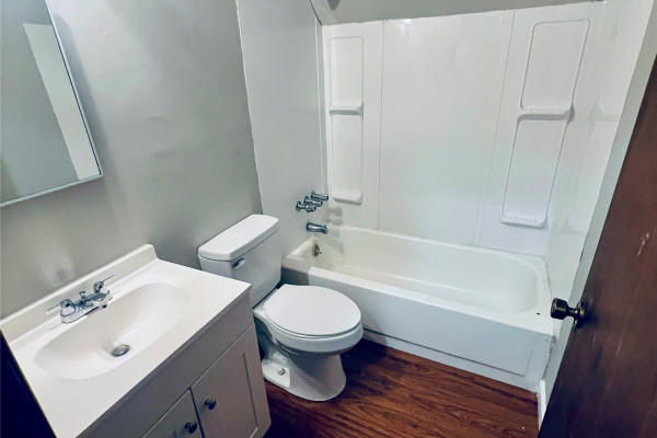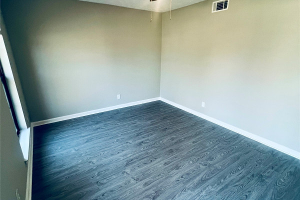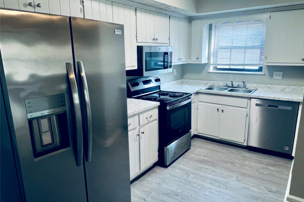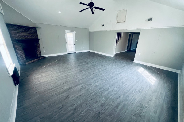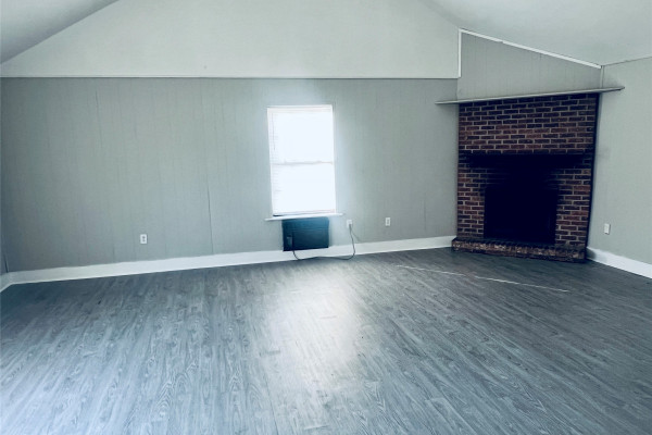 The main living areas and kitchen boast durable, stylish gray wood-plank flooring that flows seamlessly through the open spaces. The spacious living room serves as the heart of the home, featuring a vaulted ceiling that enhances the sense of scale and a classic red brick fireplace that adds warmth and character. The kitchen is a chef’s delight, equipped with sleek stainless steel appliances—including a dishwasher—paired with crisp white cabinetry and elegant marble-patterned countertops.
