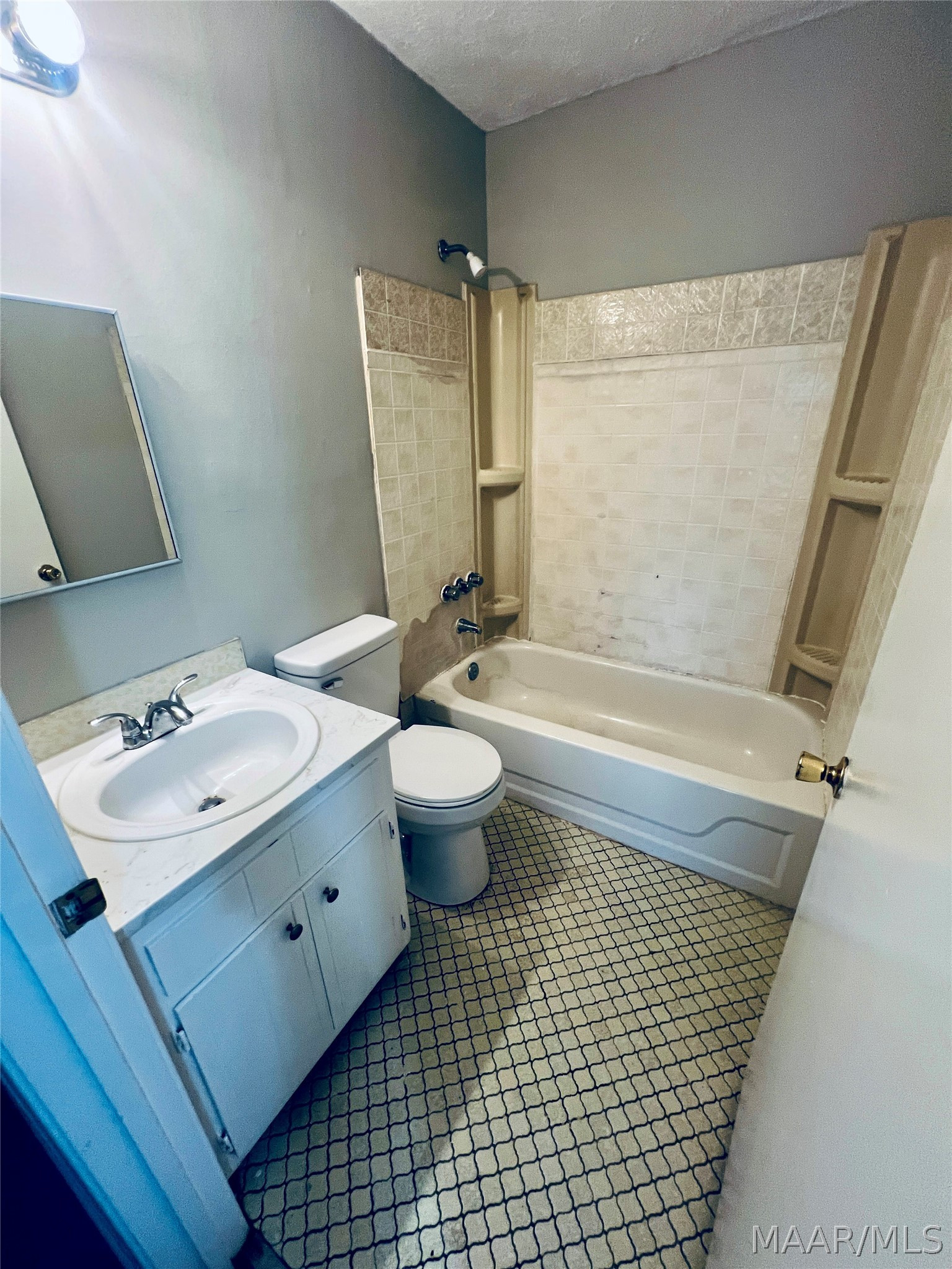 The main living areas and kitchen boast durable, stylish gray wood-plank flooring that flows seamlessly through the open spaces. The spacious living room serves as the heart of the home, featuring a vaulted ceiling that enhances the sense of scale and a classic red brick fireplace that adds warmth and character. The kitchen is a chef’s delight, equipped with sleek stainless steel appliances—including a dishwasher—paired with crisp white cabinetry and elegant marble-patterned countertops.