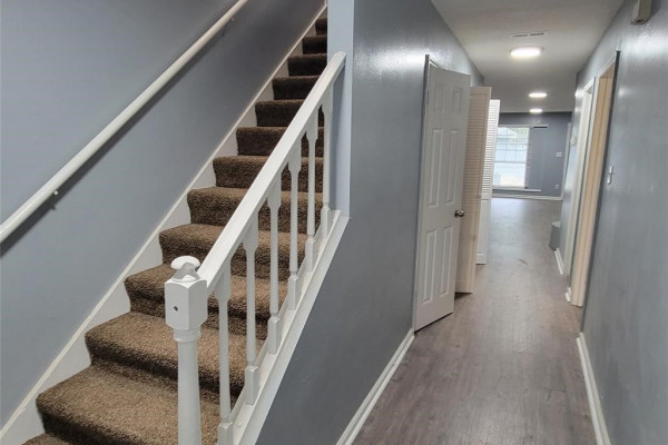 The kitchen has been completely updated with new countertops, stainless steel appliances, and a glass tile backsplash. The functional layout includes two bedrooms, a full bathroom, and a laundry room downstairs, with two additional bedrooms, a full bathroom, and a storage closet upstairs.