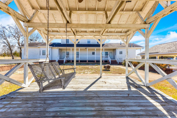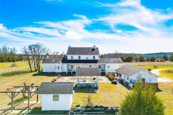Also included . . . Custom-designed staircase, three-bay garage accommodating up to six vehicles, carport, exterior storage building ideal for a workshop or efficiency apartment with bath and kitchenette, sprinkler system, two septic tanks, fiber optic installation underway, expansive porches wrapping around much of the exterior, charming gazebo.