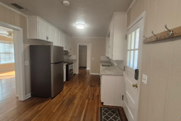 This cute, quaint, modern home is MOVE-IN READY and sits on a Corner Lot!!! This cozy 2-bedroom 1-bath home has a nice sized covered porch and enough land that separates you from your neighbors. Enter the front door to a large living room with a fireplace, granite mantel, built-in shelves, and crown molding. The Kitchen has plenty of cabinets, stainless steel appliances, new refrig, and an eat-in dining area. The bathroom entrance sits in the hallway closer to the living/kitchen areas for some privacy to both bedrooms which are extremely spacious with roomy closets. Aside from plenty of yard, there is a detached storage shed for all your lawncare essentials. All windows are thermal, the roof is 2 years old, hot water heater replaced in 2019, and the heating/cooling was recently serviced by Bill Bradley. Owner never used dishwasher or fireplace. You don’t want to miss this economical starter home! Washer and Dryer included with an acceptable offer. Home has a Termite bond that is transferable.