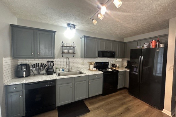 Eat-in kitchen with deep sink, refrigerator, stove, microwave, and dishwasher included