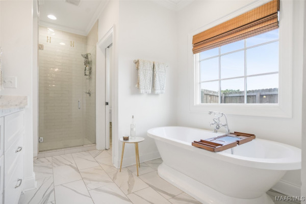 All bedrooms are spacious with ample closet space, and the primary suite is a true retreat with a stunning bathroom that includes a marble double vanity, a freestanding tub, and a separate shower. The attached dressing area features a custom-built dresser.
