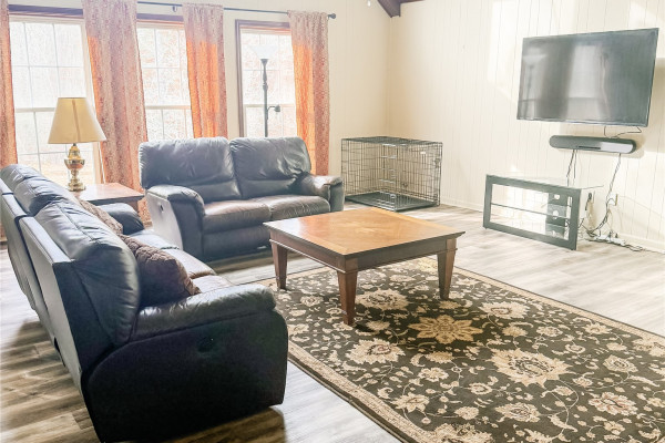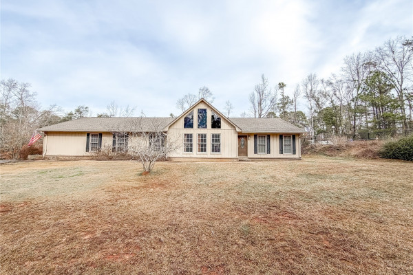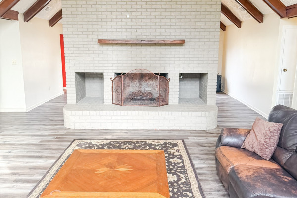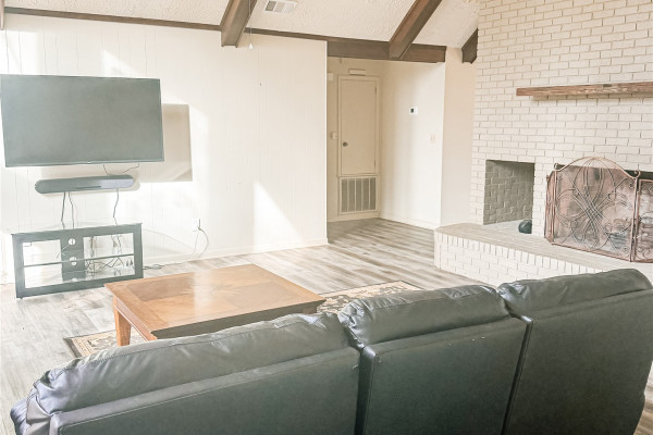 Welcome home to this inviting and well-maintained property offering space, comfort, and timeless character. The living room features soaring vaulted ceilings and exposed beams and a striking painted brick fireplace that serves as the heart of the home. Large windows fill the space with natural light, creating a warm and welcoming atmosphere.