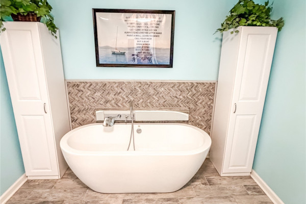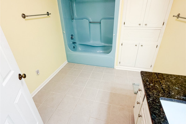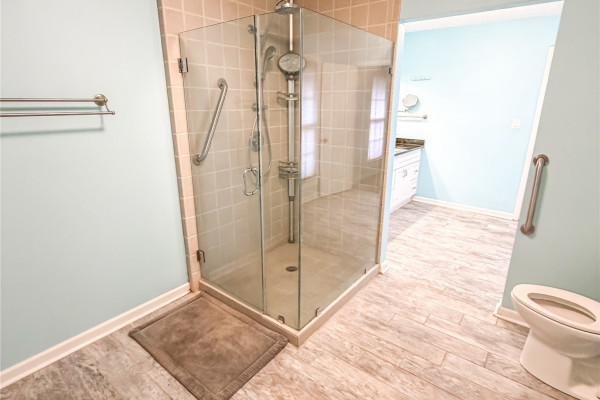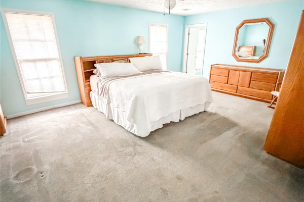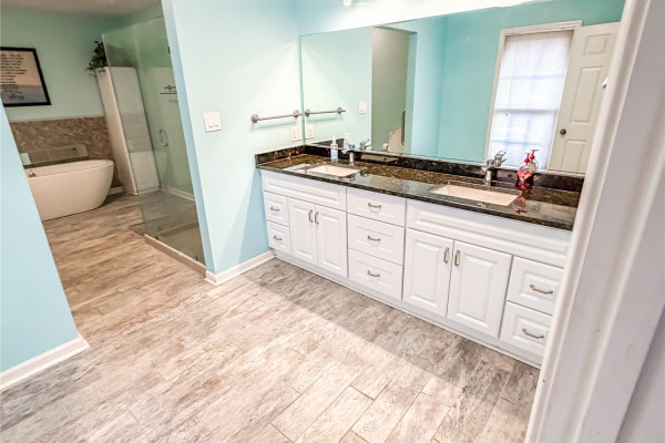 The open-concept layout flows seamlessly into the dining area, kitchen and adjacent spaces, making it ideal for everyday living and entertaining. The primary suite is generously sized with plenty of room for a sitting area and includes a beautifully updated bathroom featuring a double vanity, modern fixtures and a stunning freestanding soaking tub.