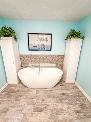 The open-concept layout flows seamlessly into the dining area, kitchen and adjacent spaces, making it ideal for everyday living and entertaining. The primary suite is generously sized with plenty of room for a sitting area and includes a beautifully updated bathroom featuring a double vanity, modern fixtures and a stunning freestanding soaking tub.