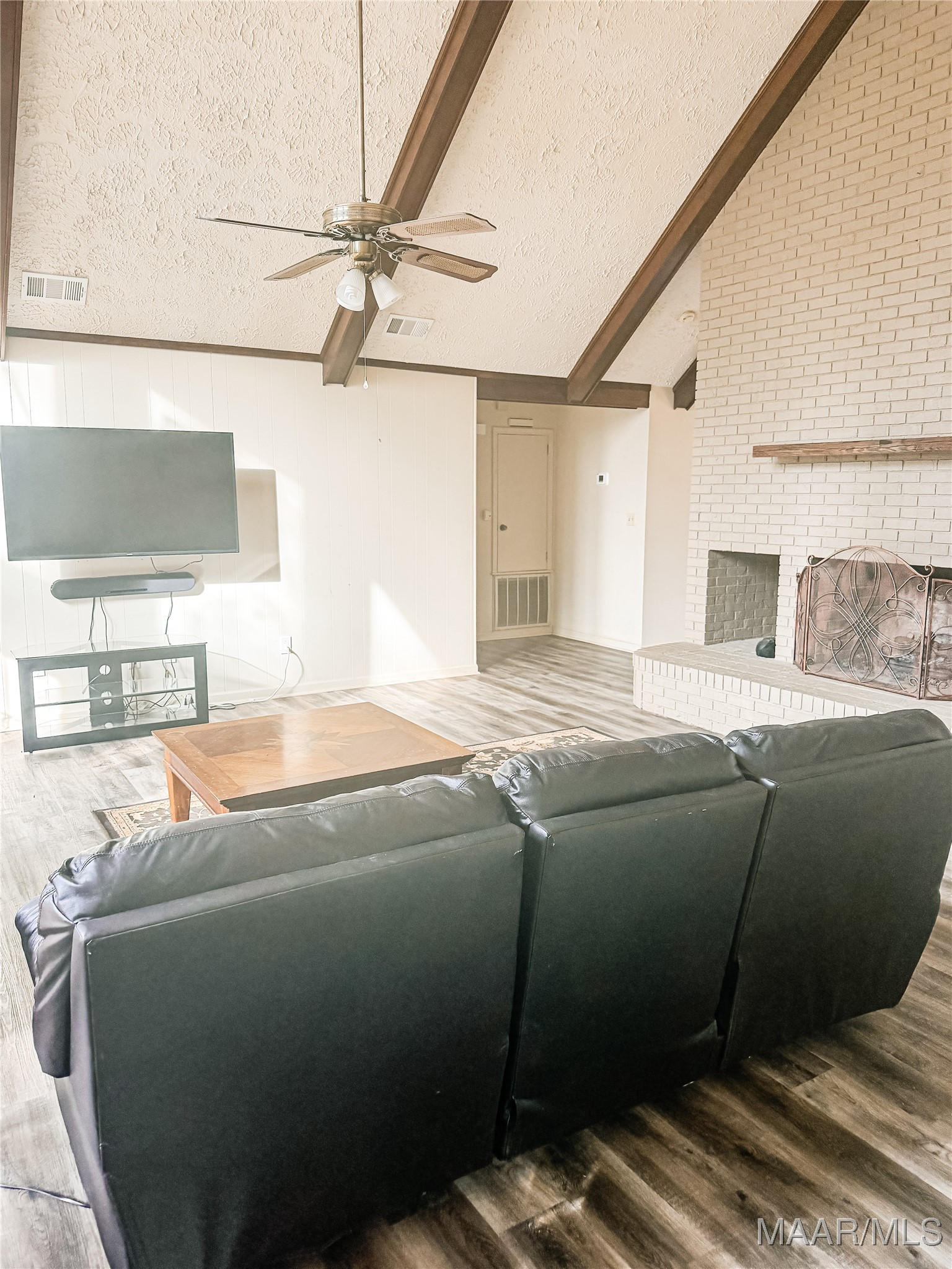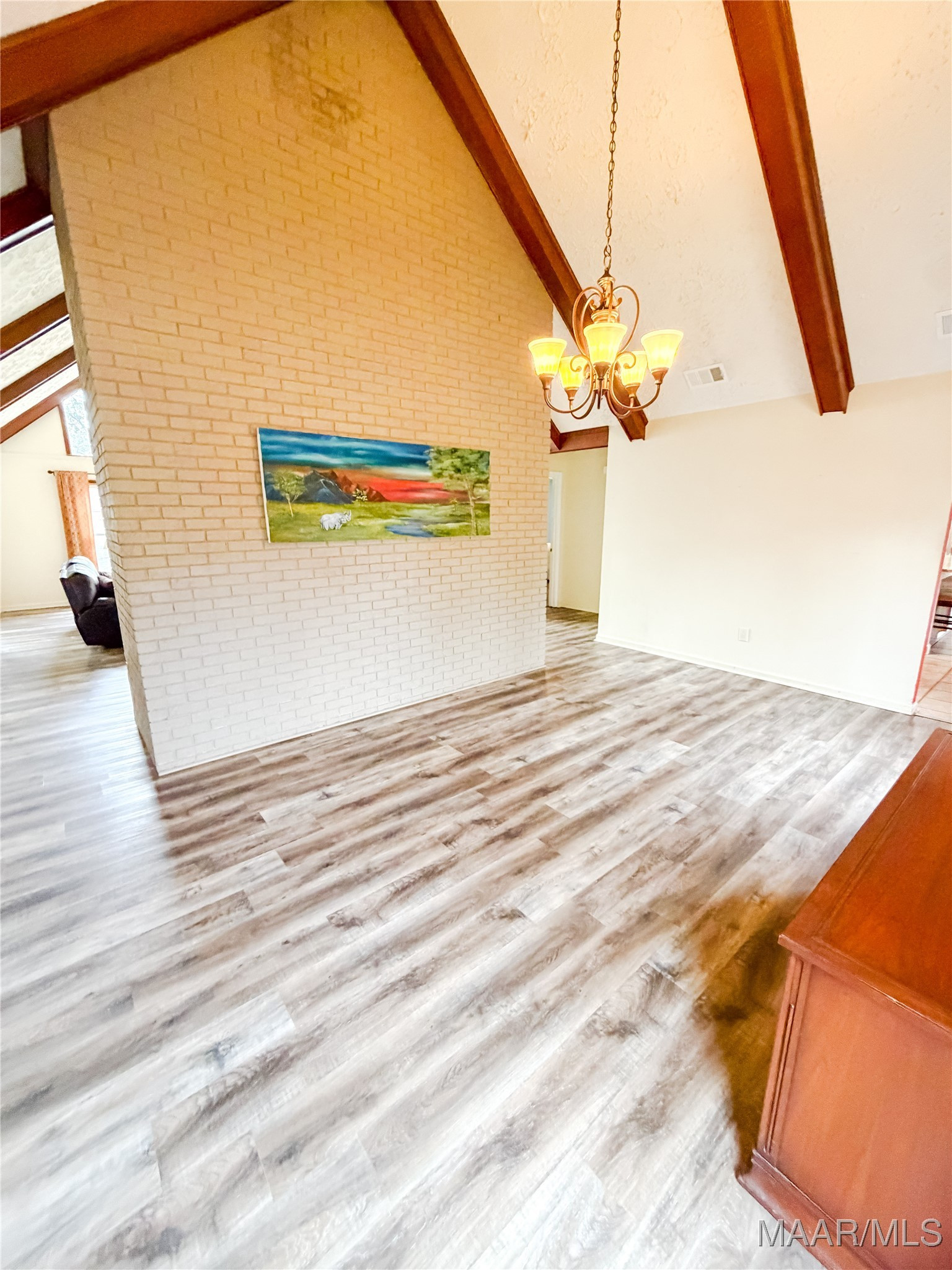 Welcome home to this inviting and well-maintained property offering space, comfort, and timeless character. The living room features soaring vaulted ceilings and exposed beams and a striking painted brick fireplace that serves as the heart of the home. Large windows fill the space with natural light, creating a warm and welcoming atmosphere.