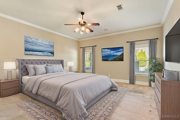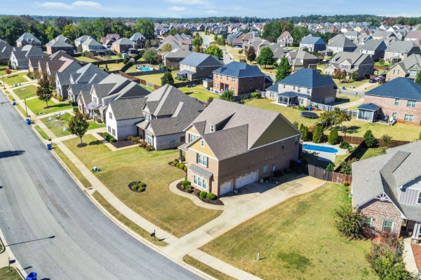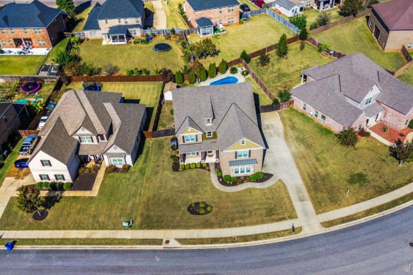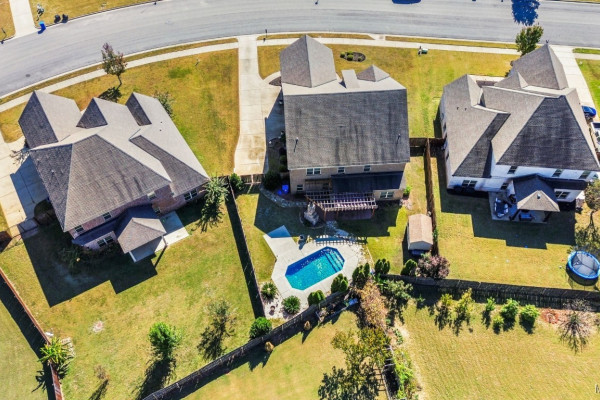 Entertain in style where space feels endless with the kitchen open to the dining room, living room and eat in kitchen that continues to flow onto the covered patio with an outdoor fireplace making the space cozy next to your personal pool year round. There is an office/den on the main level that can be afforded privacy by closing the designer french doors. The large primary suite is located on the main level that has a soaking tub, large tile shower, separate vanities and huge walk in closet. Upstairs you will find 5 generous sized bedroom and 2 full bathrooms.This home also has a 3 car garage and large parking pad. You may also enjoy the 3 community pools, splash pad, playground, walking track, lake and common areas of this wonderful community.