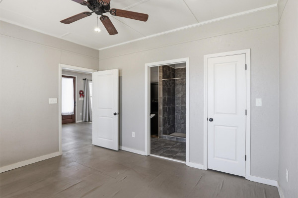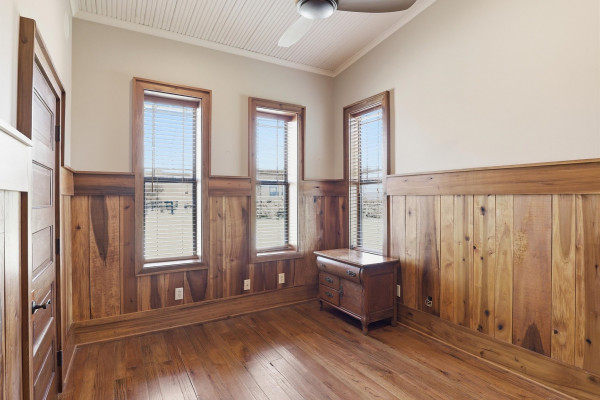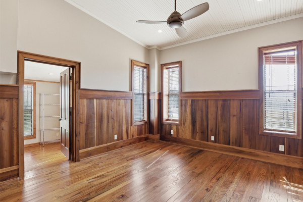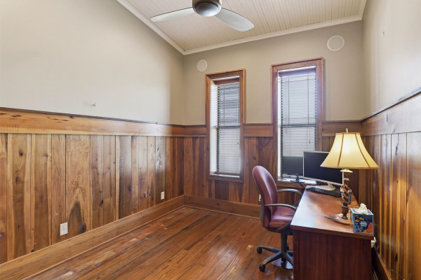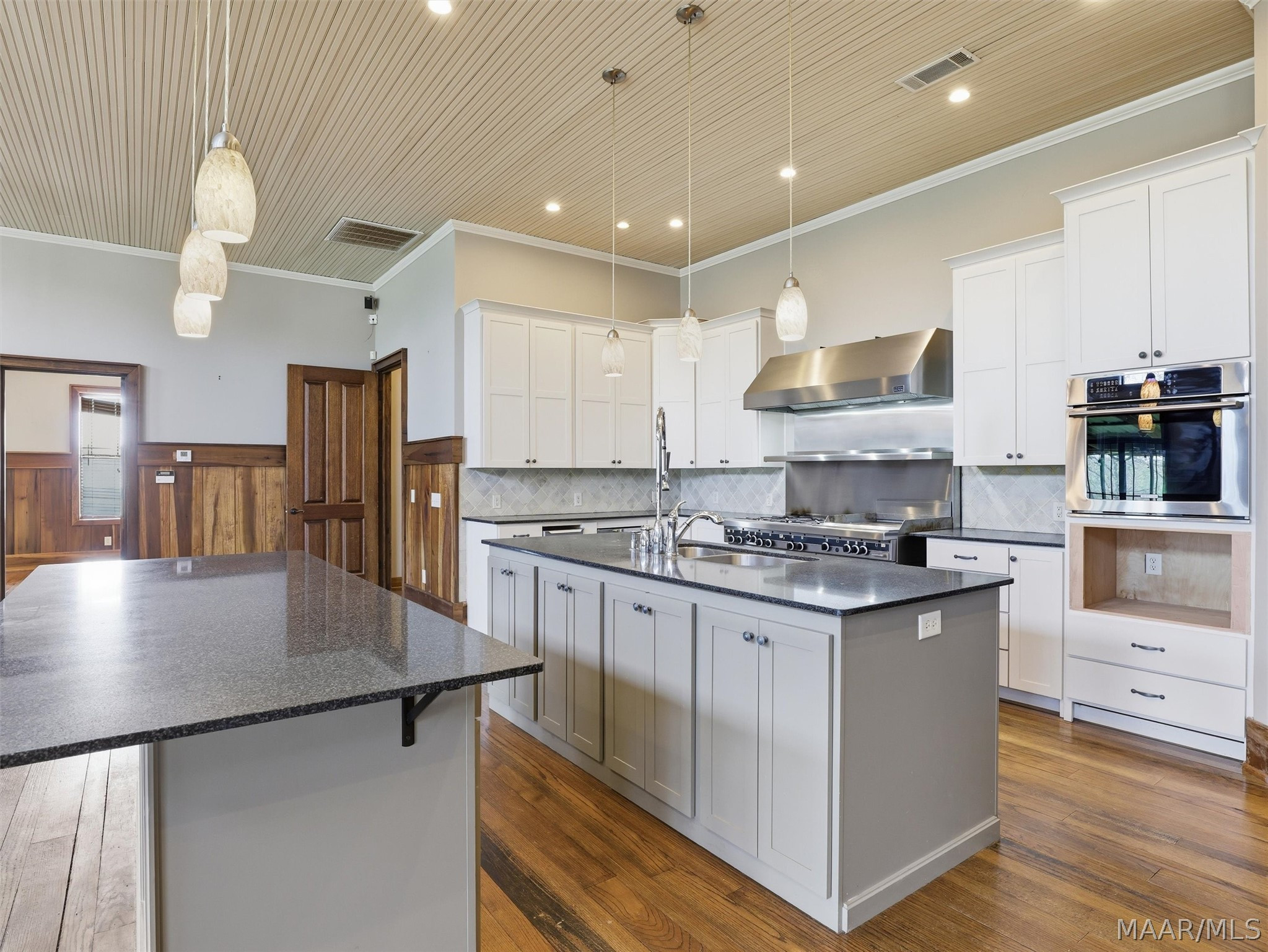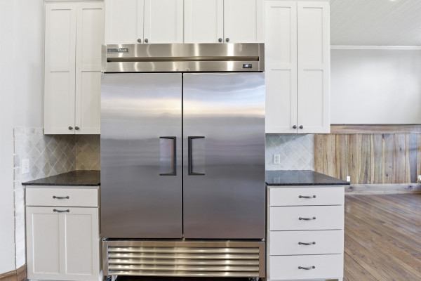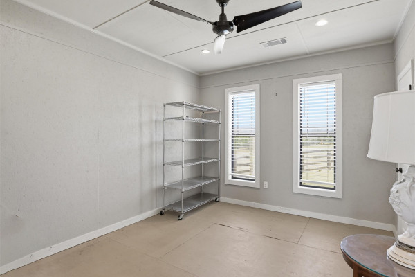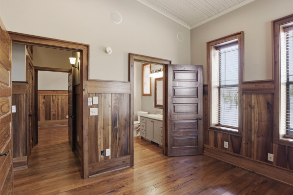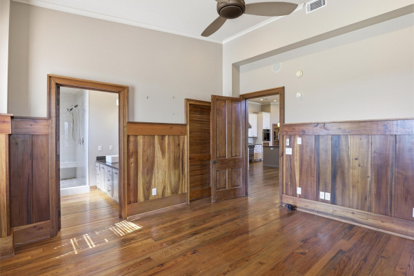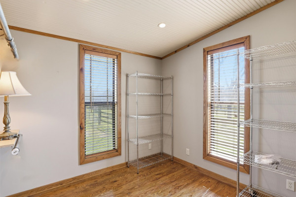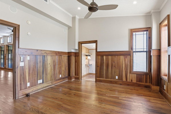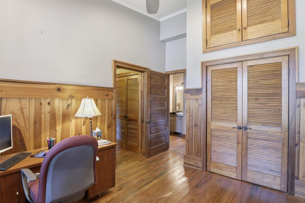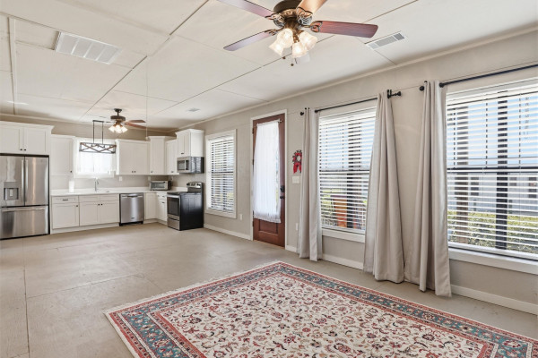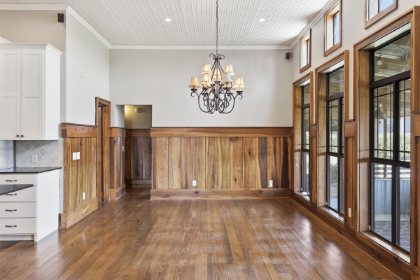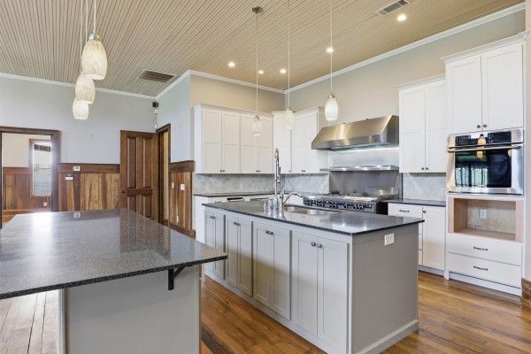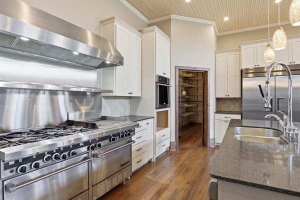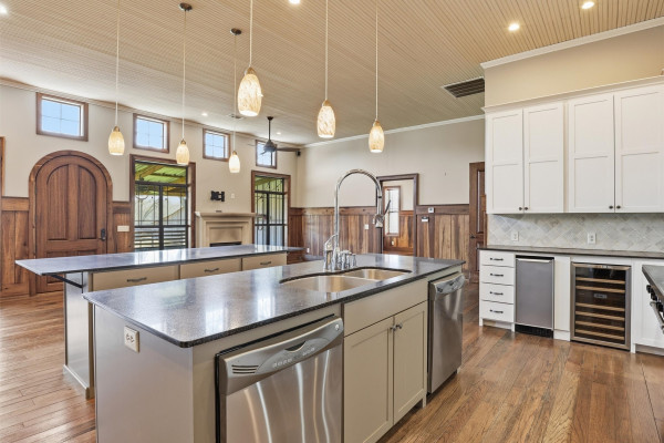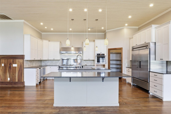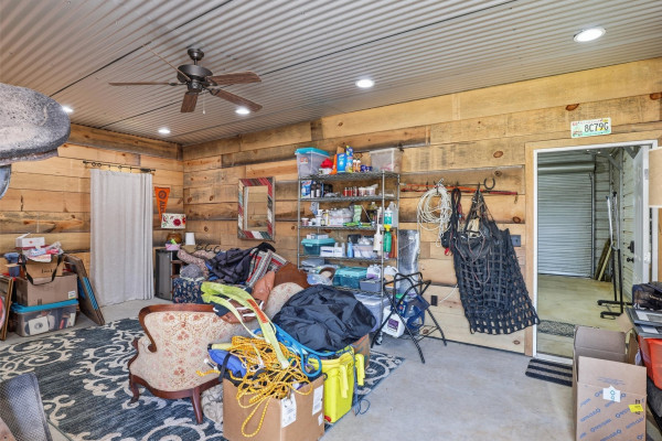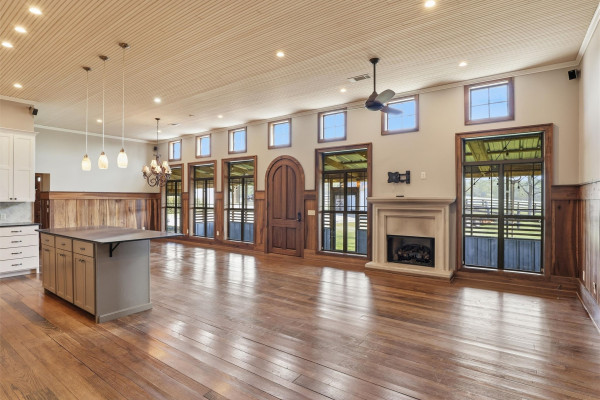 The barndominium living quarters is a masterpiece living space with 11 ft. + ceilings, beautiful wood paneling, an entertaining kitchen with all commercial appliances and a master suite with 2 large walk-in closets and a luxurious master bath.