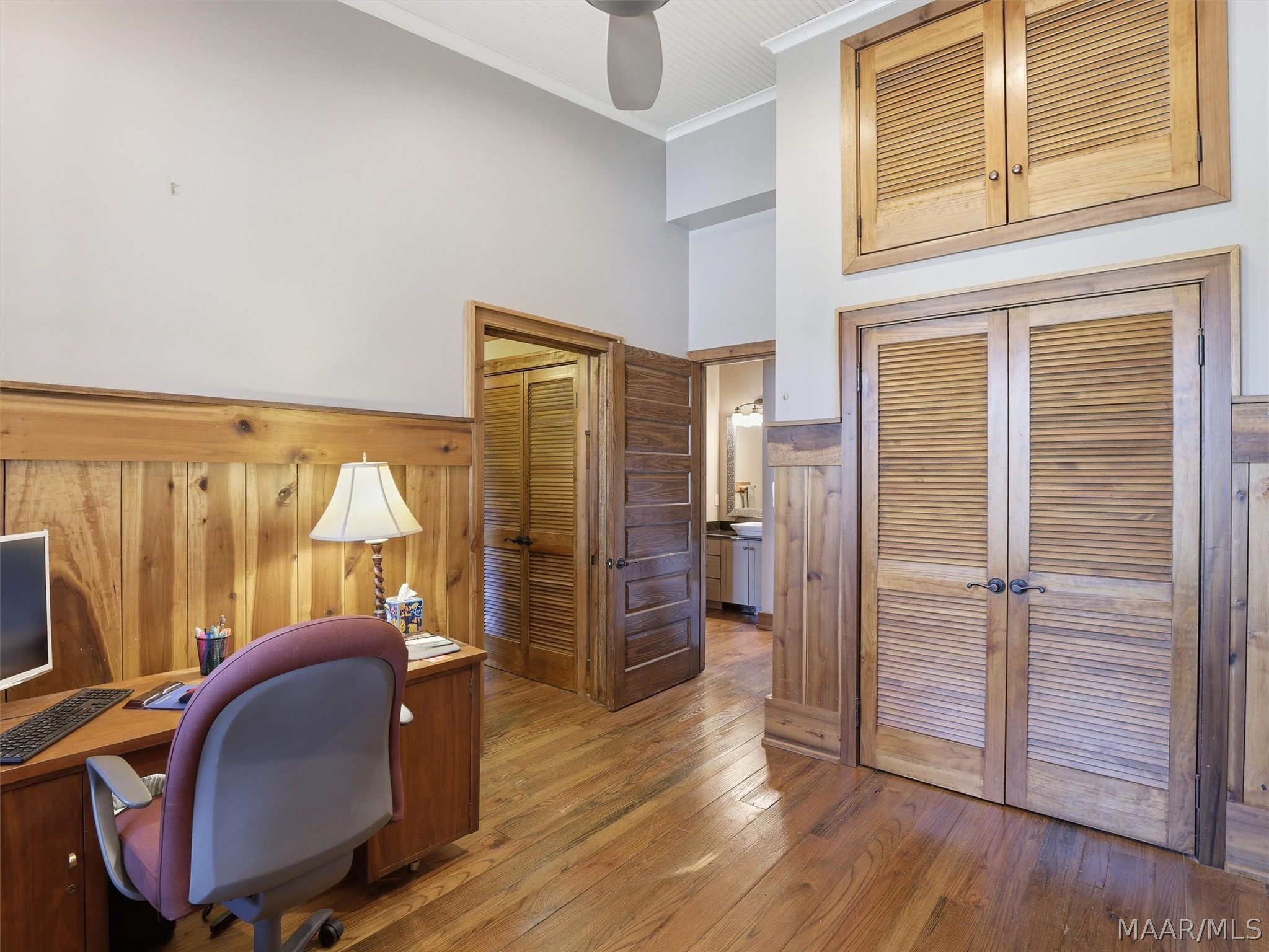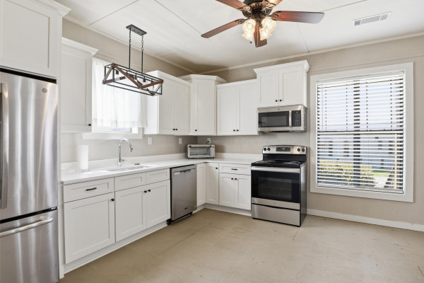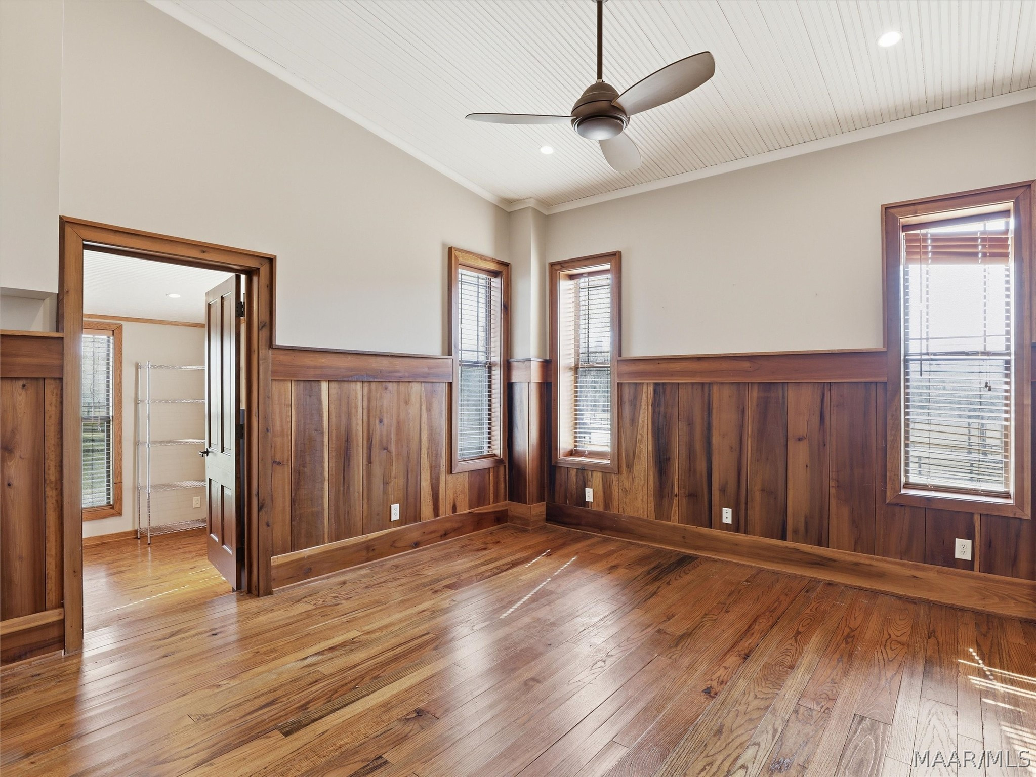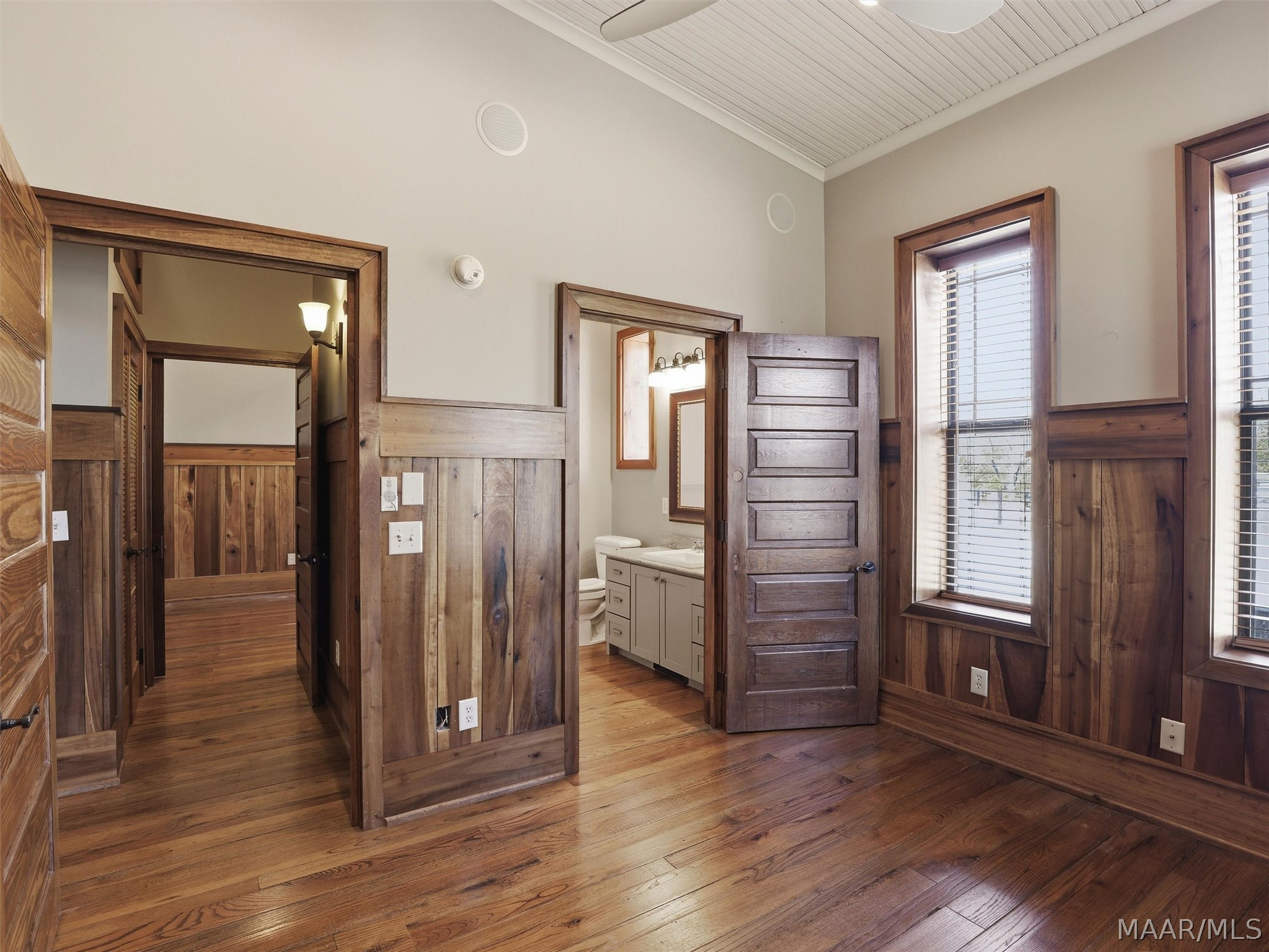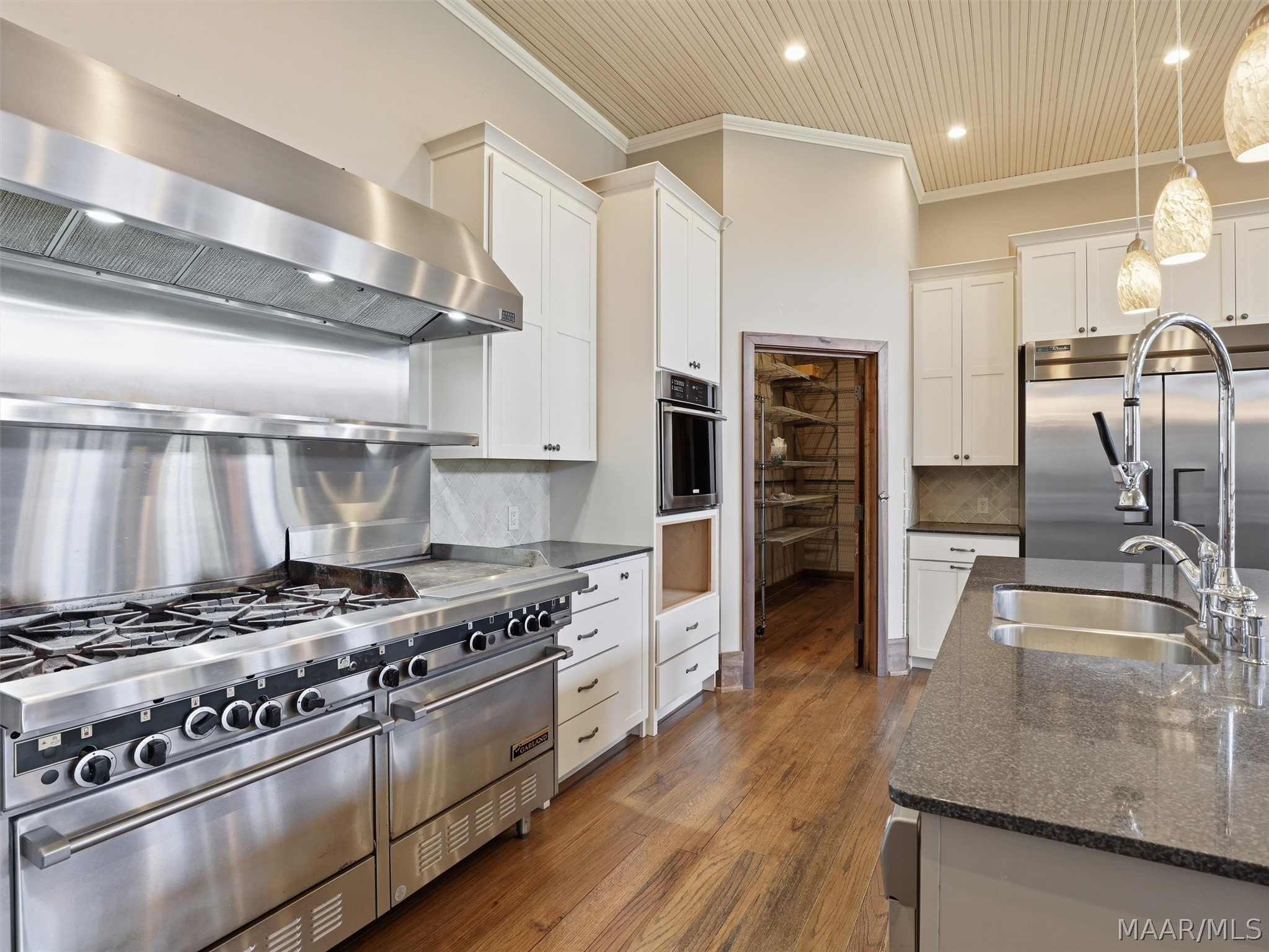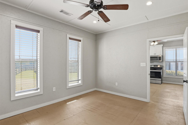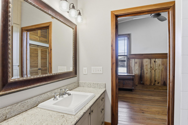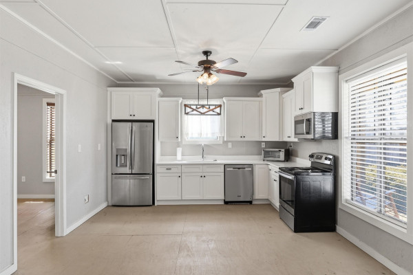 The barndominium living quarters is a masterpiece living space with 11 ft. + ceilings, beautiful wood paneling, an entertaining kitchen with all commercial appliances and a master suite with 2 large walk-in closets and a luxurious master bath.