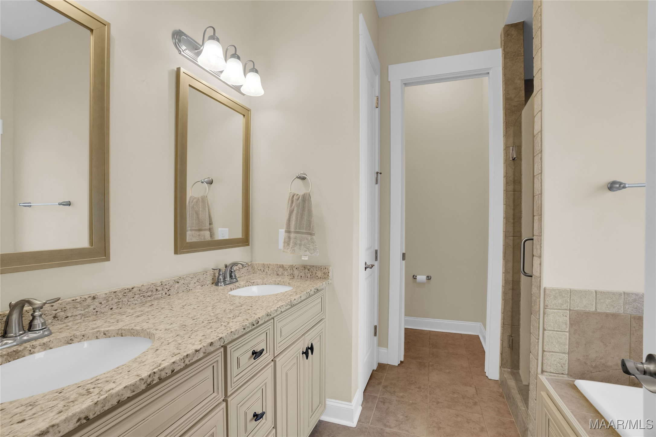 Also downstairs are the spacious primary suite, a laundry room, an office nook with built-in desk, and a convenient half bath. The primary bath features a double vanity, garden tub, and separate shower.