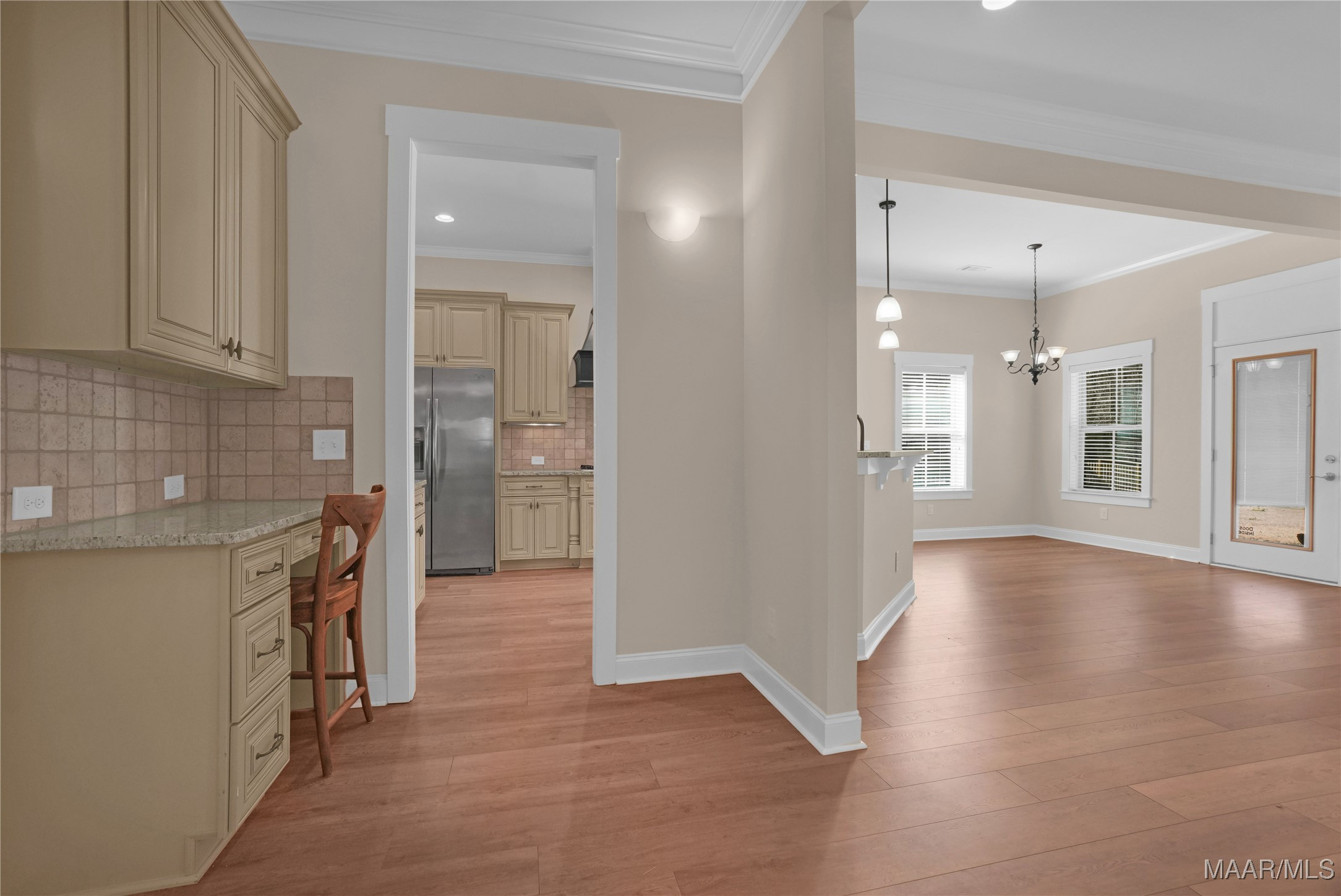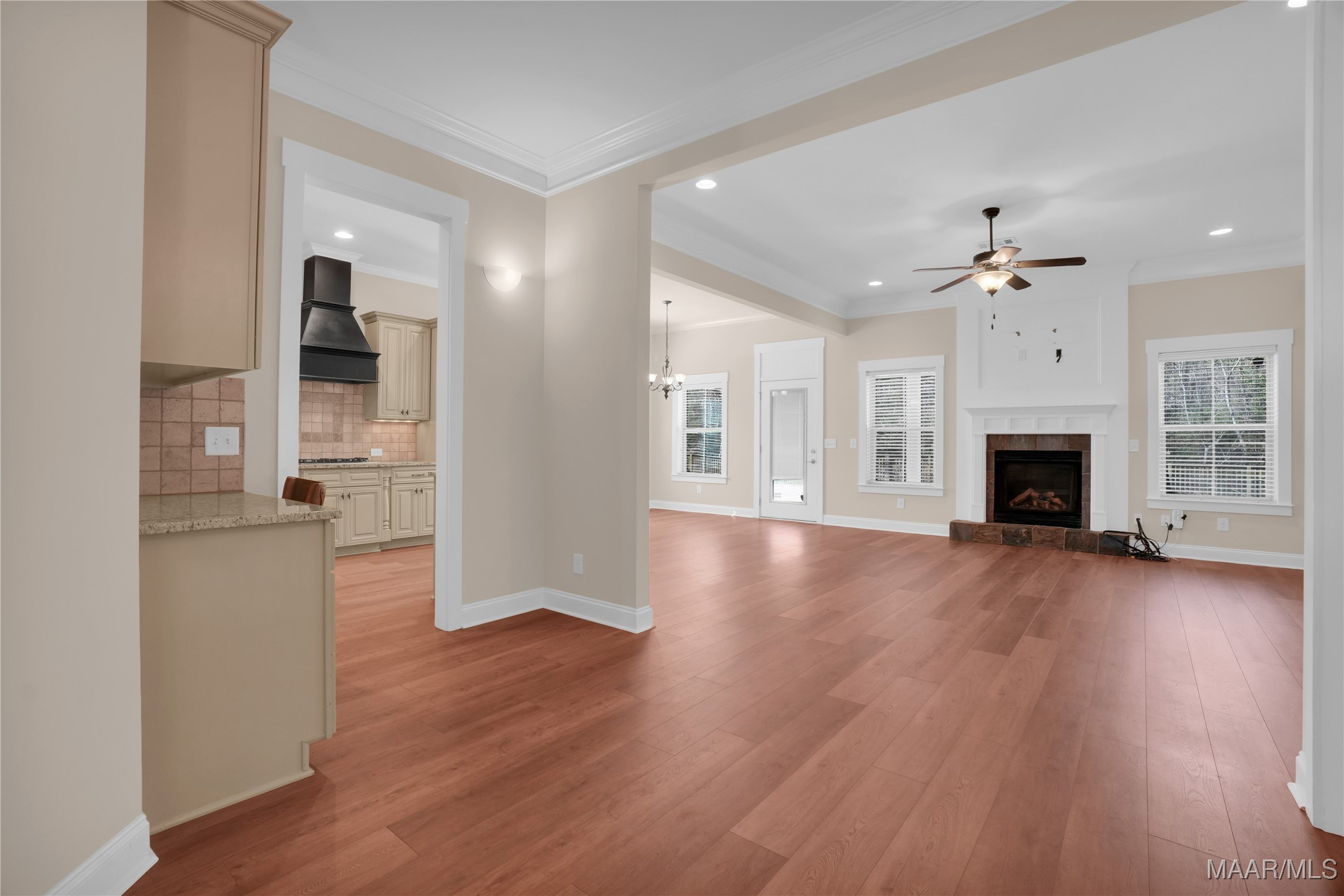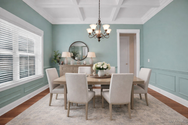 The main level welcomes you with a gracious foyer leading into a beautiful formal dining room highlighted by a coffered ceiling and wainscoting. The large great room offers a cozy fireplace with gas logs and flows seamlessly into the well appointed kitchen, complete with a gas cooktop and decorative range hood, granite countertops, under cabinet lighting, wall oven and microwave, breakfast bar, pantry, and ample cabinet and counter space. A bright breakfast nook overlooks the backyard, creating the perfect spot for casual meals.
