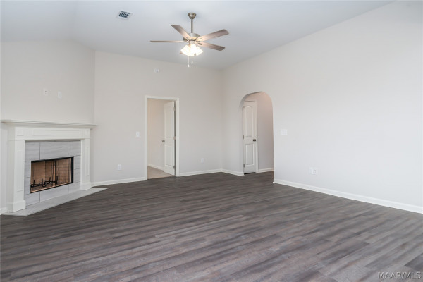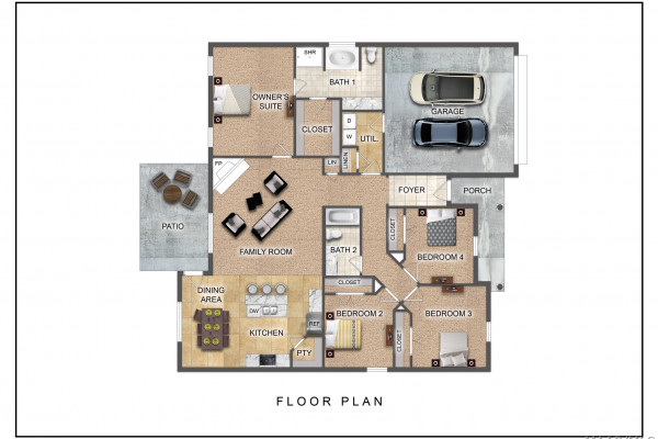 Serenity begins when you enter the Sawgrass floor plan. The Sawgrass was built with four well sized bedrooms and two bathrooms. Every square foot of this well thought out floor plan was made for living comfortably. This floor plan boasts an open concept living area for an update and modern style. The living room is the perfect space to enjoy time curled up in front of the tiled woodburning fireplace. While the connected eat in kitchen is well set up for hosting guests with its great layout and workflow. The energy star appliances this eat in kitchen enjoys are ideal for a budding chef or choose to utilize the ample counterspace on the kitchen island if you’re a takeout fan instead. The best part of having four bedrooms to fit everyone’s needs is knowing that the owner’s suite is tucked away and offers itself as a private haven with a walk-in closet that fits every wardrobe. The owner’s suite bathroom is truly a retreat, designed with dual vanity sinks and a separate garden tub so you can soak the day away. When you do decide to leave the sanctuary of your room, you can spend your time blissfully lounging on the poured concrete patio or front porch knowing that this one-story floor plan is low- maintenance and move-in ready. You’ll also have peace of mind knowing that the Sawgrass is equipped with features that keep your monthly utility bills low, like a heat pump hot water heater, spray foam insulation, and double paned low E vinyl windows. Features include: 10′ Ceiling in Family Room | Wood Burning Fireplace | Large Kitchen Island with Breakfast Bar | Dining Area & Breakfast Nook; Separate Garden Tub & Shower in Master Bath | Double Vanities in Master | Large Walk-in Closets| Raised Vanities | Hard Tile in Fireplace & Bath: Centrally Wired Command Center | Garage Door Openers: Spray Foam Insulation in All Exterior Walls & Roof Line | Energy Saving Heat Pump Hot Water Heater