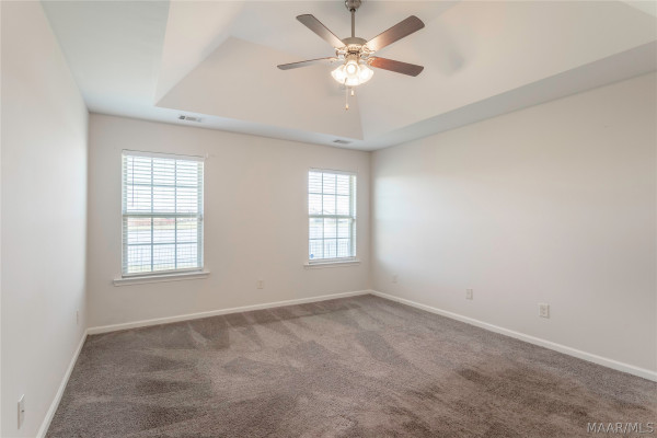 The large master suite features a 10-inch trey ceiling, generous walk-in closets, and a private master bath with a double vanity, relaxing garden tub, and separate shower.