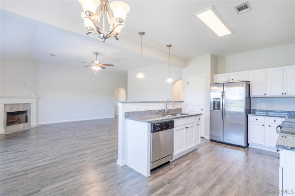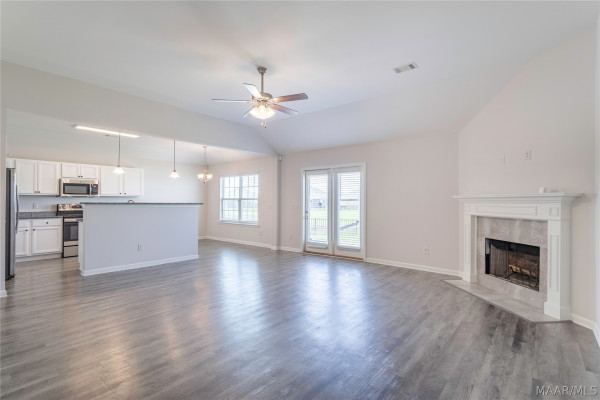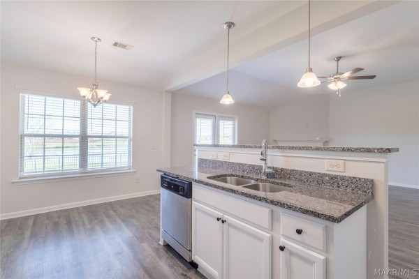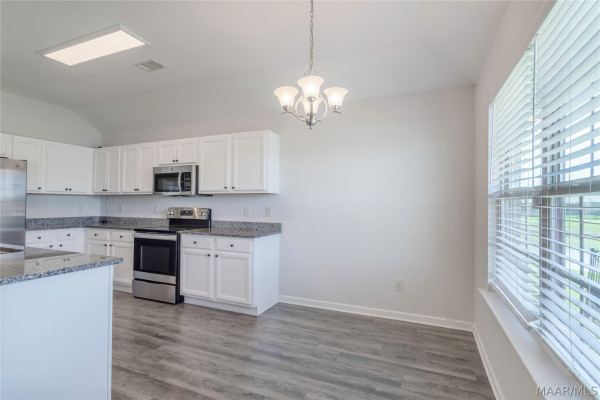 The kitchen comes fully equipped with Energy Star appliances, including a dishwasher, stove, garbage disposal, and built-in microwave.