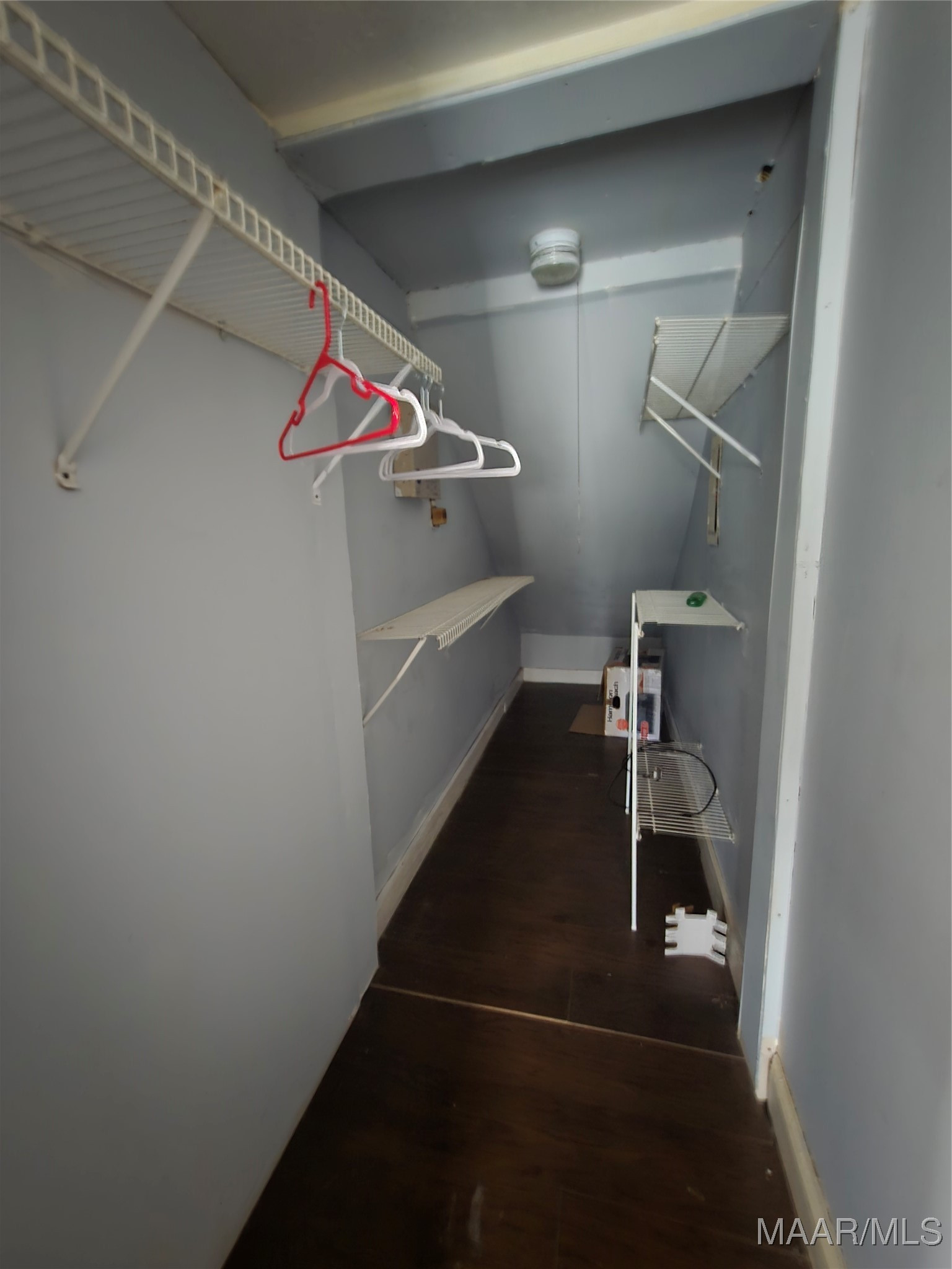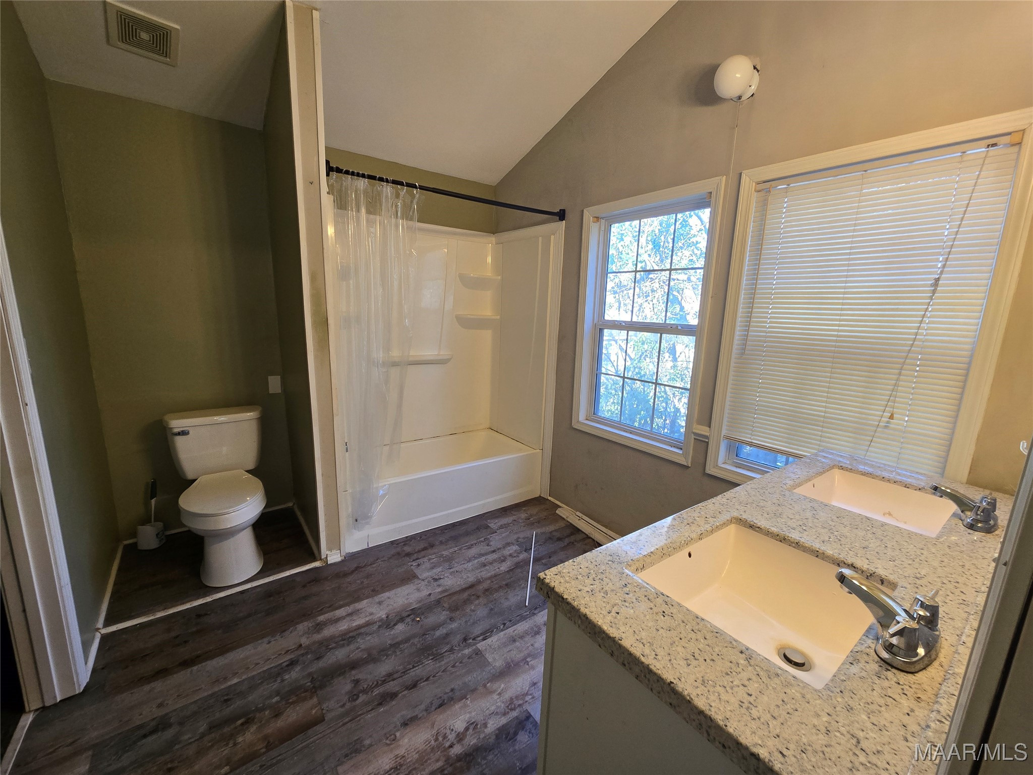 Additional highlights include laminate wood flooring throughout, balcony access from one bedroom, a downstairs living room, and a spacious primary suite with a walk-in closet and vaulted ceiling.