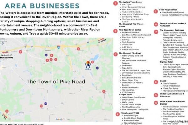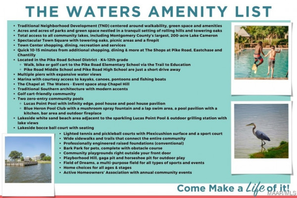 Come Make a Life of It at The Waters in Pike Road, AL! Enjoy resort-style living with world-class fishing, multiple lakes, swimming pools, tennis and pickleball courts, a lakeside beach, dog park, town square, fire pit, soccer field, Playborhood Hill, bocce ball, green space, pavilions, a sport court, gaga pit, kayaking, canoeing, playgrounds, parks, and the Trail to Education leading to the Pike Road Elementary school. Shop and dine at our Town Center businesses or take a short drive to Pike Road Shopping, Eastchase, and Chantilly. Just 2.5 miles off I-85, Exit 16, and zoned for Pike Road Schools (K4-12th grade). Make your dream vacation your everyday life! Seller reserves the right to approve buyer’s mortgage lender.