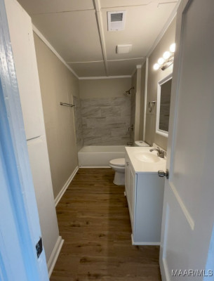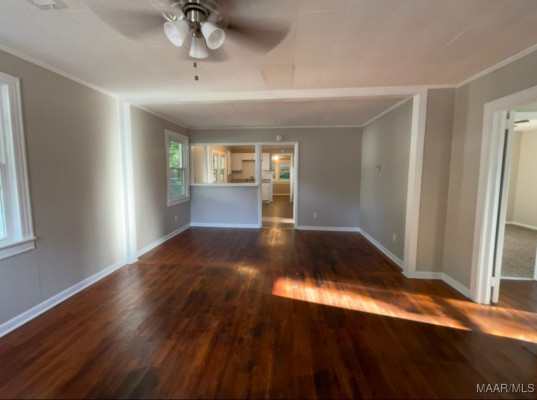 The bathroom has a tub/ shower combo and has been fully updated with a modern vanity, custom tile, and a linen cabinet. Additional features include a large laundry room, attached storage room with a separate entrance, a private back porch, and a fenced yard that adds extra appeal for tenants. There’s an empty lot next door offering more privacy. The inviting front porch creates great curb appeal and a warm, welcoming entry with a doorbell. The long drive way gives ample parking and extends to the back for rear parking.