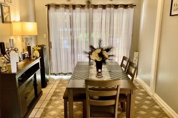 The dinning area has glass patio doors that open to a generous backyard — perfect for entertaining or relaxing.
