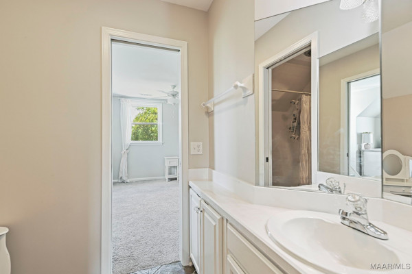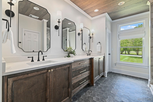 The spacious primary suite is located on the main level and features large windows that flood the space with natural light. The spa-like bathroom is a true retreat, with a unique hexagon tile floor, custom inset cabinetry, quartz countertops, and a luxurious oversized shower with a rainhead and multiple faucets. A separate makeup vanity adds both function and flair.
