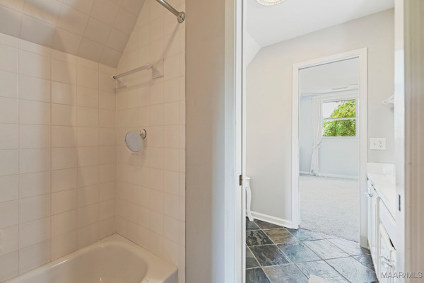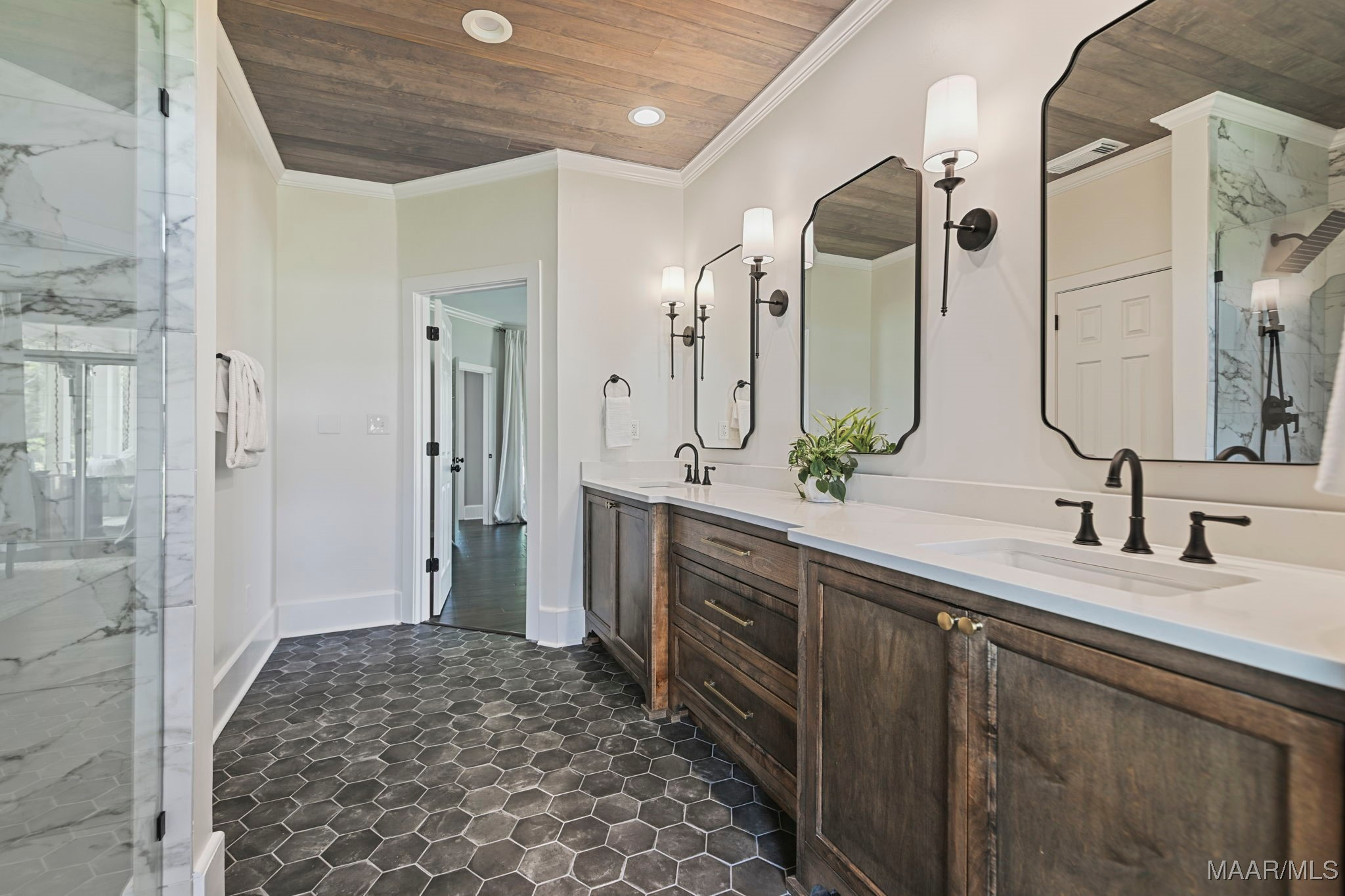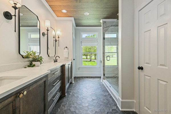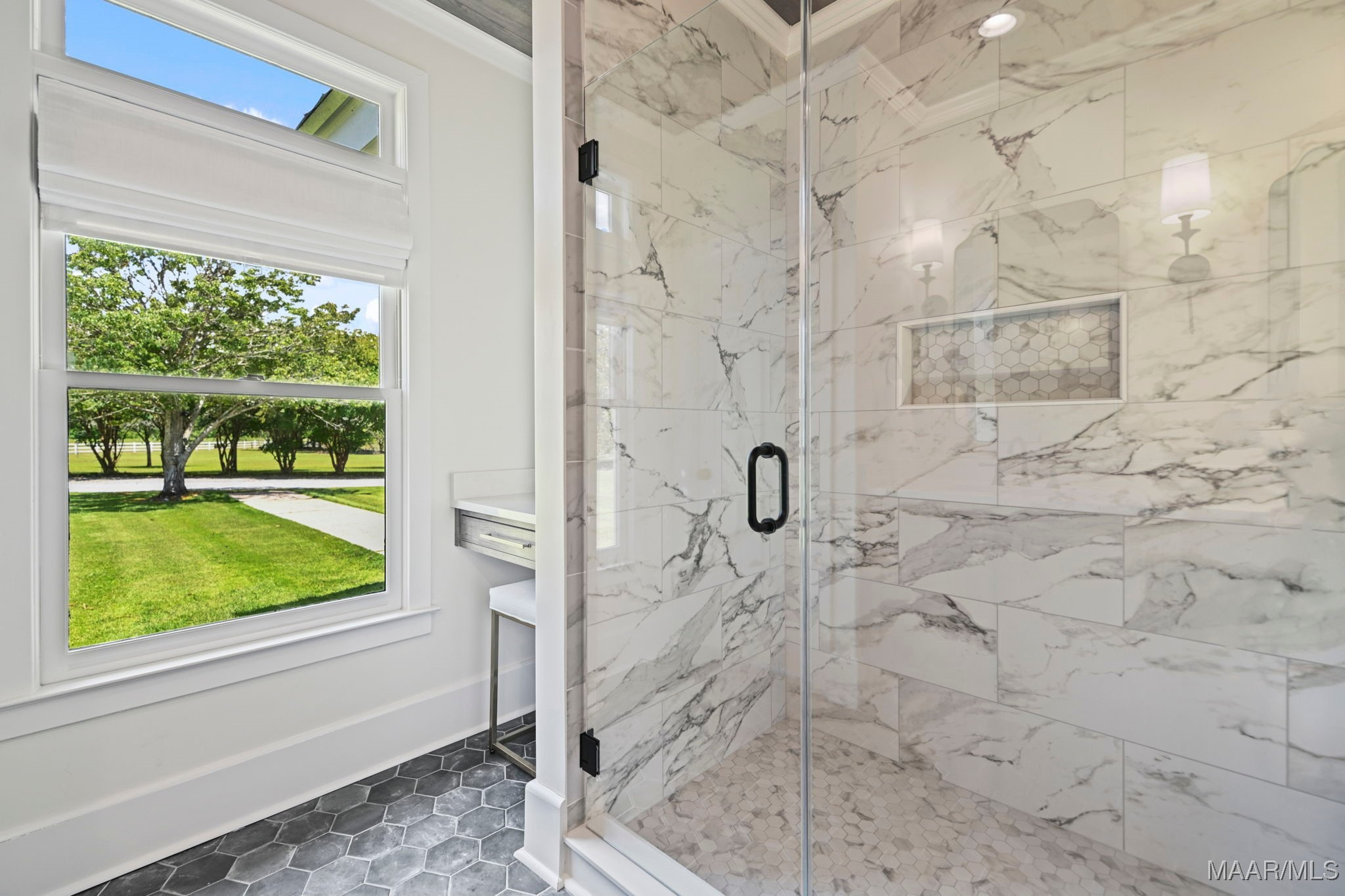 The spacious primary suite is located on the main level and features large windows that flood the space with natural light. The spa-like bathroom is a true retreat, with a unique hexagon tile floor, custom inset cabinetry, quartz countertops, and a luxurious oversized shower with a rainhead and multiple faucets. A separate makeup vanity adds both function and flair.