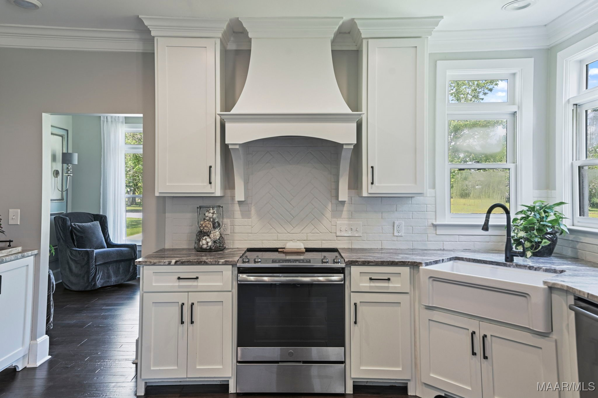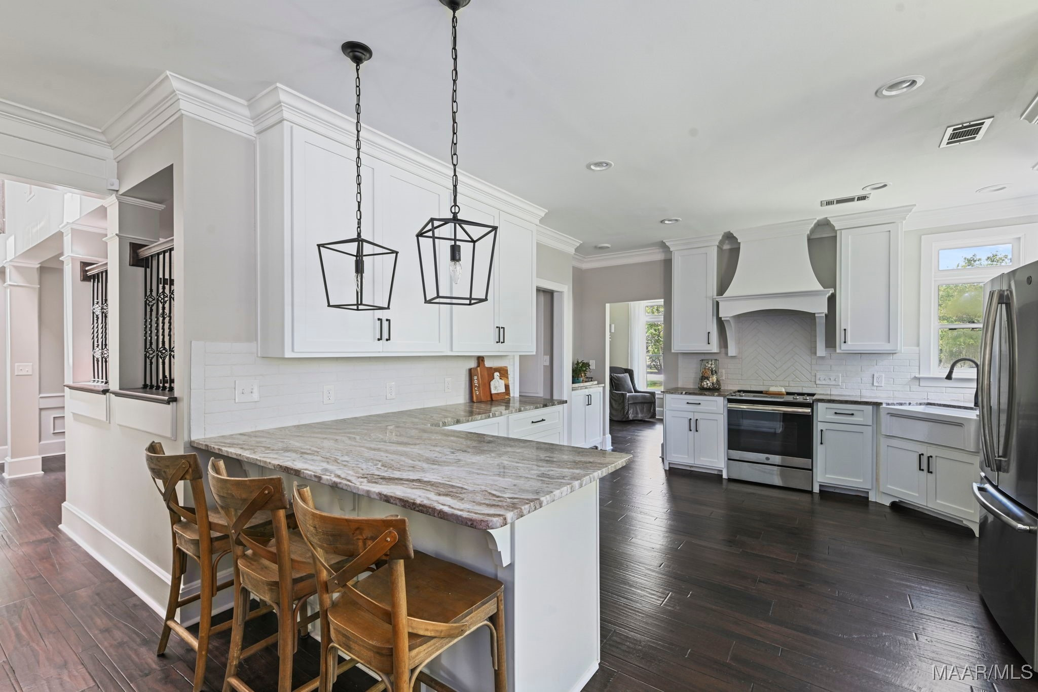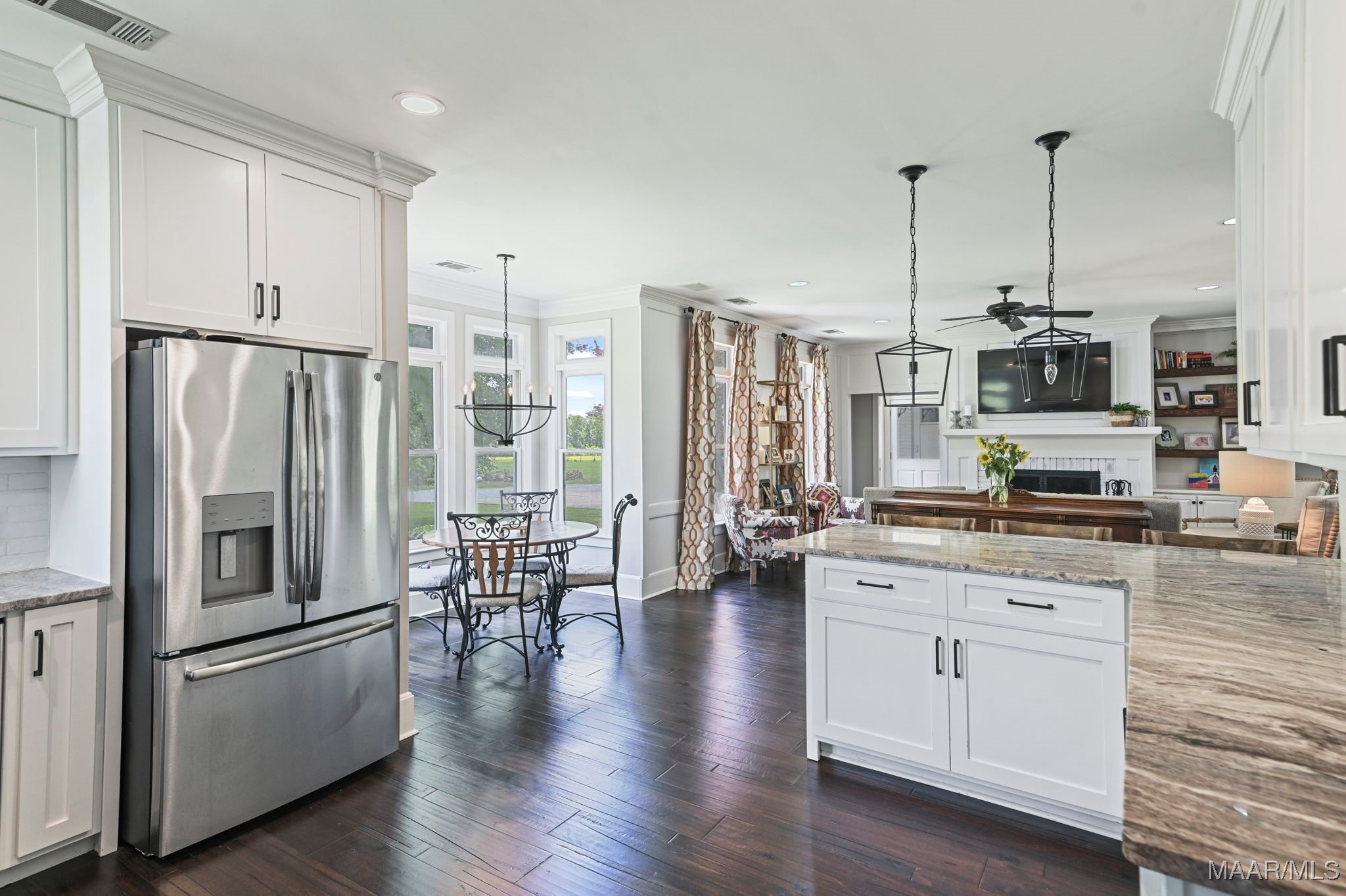 The living area boasts rich dark hardwood floors, a real wood-burning fireplace, and custom built-ins, all open to the oversized kitchen. Here you’ll find granite countertops, custom cabinetry, an apron-front farmhouse sink, and thoughtful details throughout. A nearby powder room and generous laundry room with sink offer convenience, along with stair access to a large bonus room over the two-car garage and tons of floored attic storage.