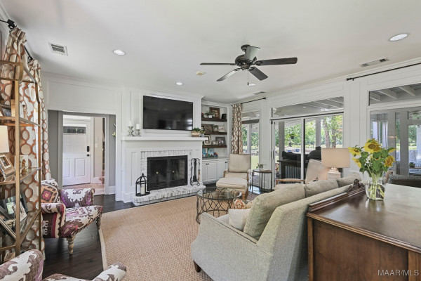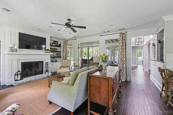 Step through the elegant wood and glass front door into a warm brick-floored foyer that opens to a spacious dining room, easily accommodating 8–10 guests. Off the entry, a cozy sitting room doubles as an office or second den, flowing seamlessly into the heart of the home.