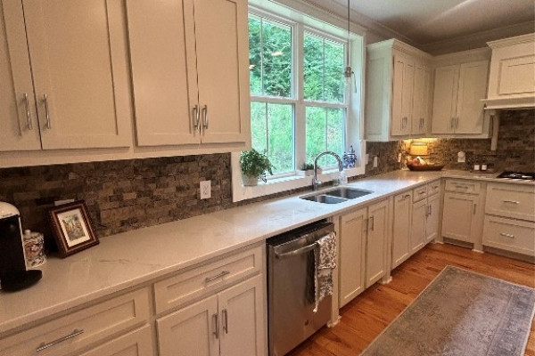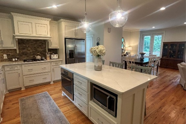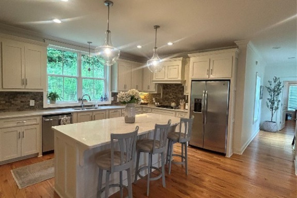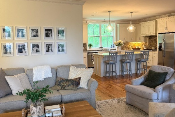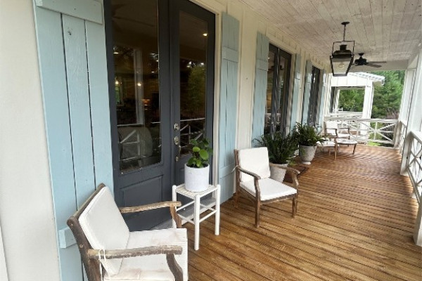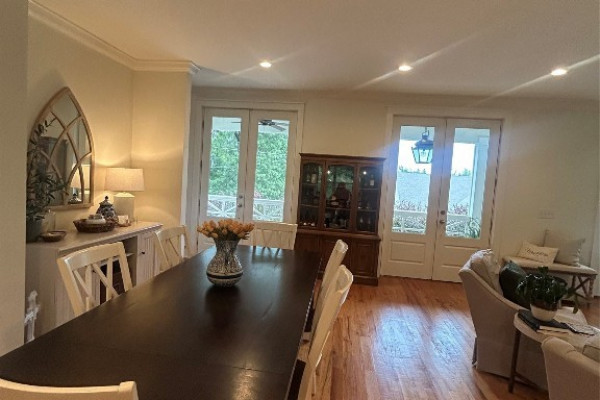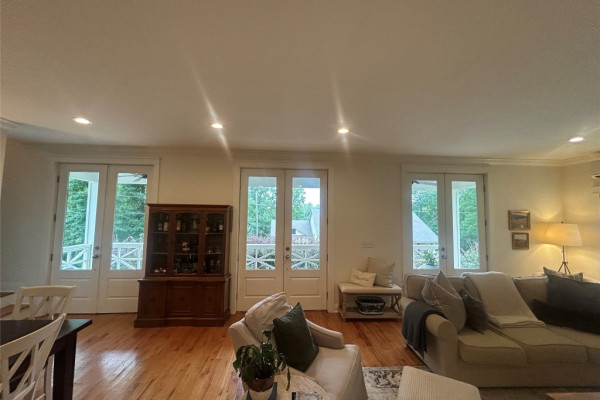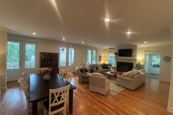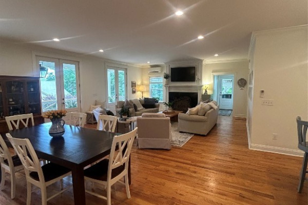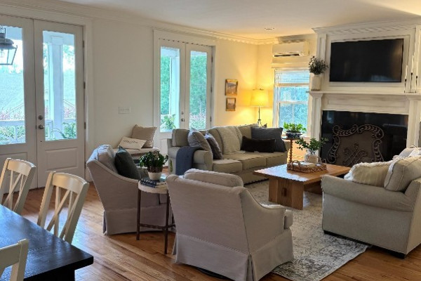 As you step inside, the spacious great room is a true showstopper, featuring a cozy gas log fireplace and three striking French doors that open onto a spacious front porch, perfect for both lively gatherings and quiet evenings in.