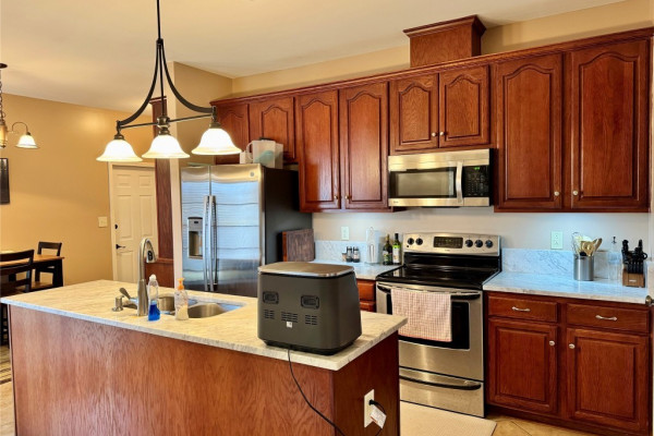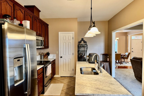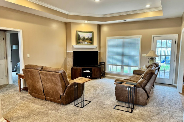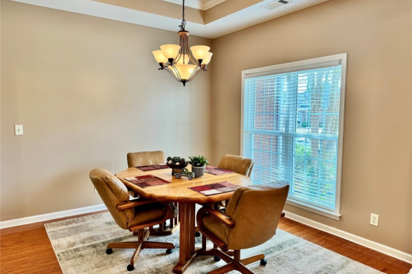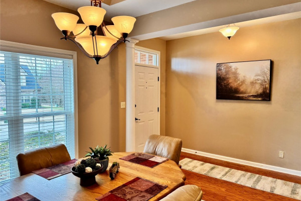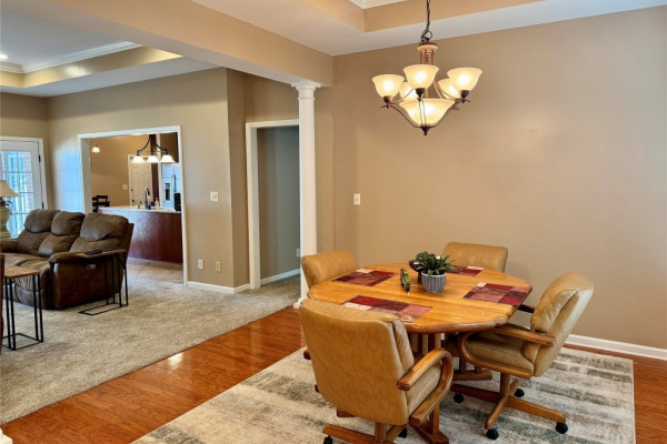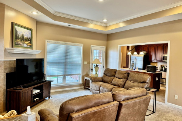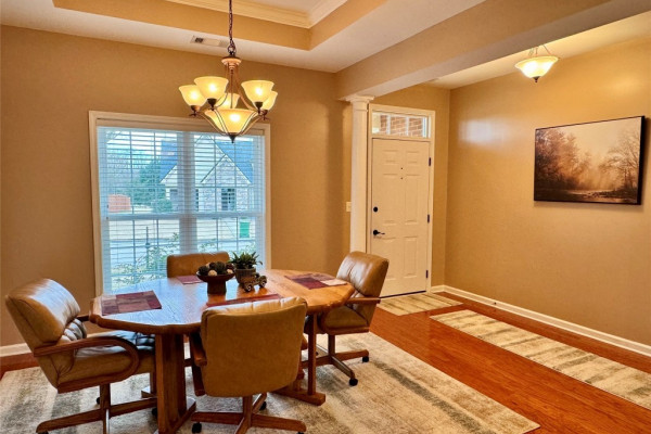 Inside, hardwood floors greet you at the entry and flow into a spacious living room featuring tray ceilings and a wood-burning fireplace. Abundant natural light, architectural columns, and thoughtful details create a warm and inviting atmosphere throughout. The kitchen is semi-private yet open to the main living area, with tile flooring extending through both the kitchen and dining space—ideal for daily living and entertaining.