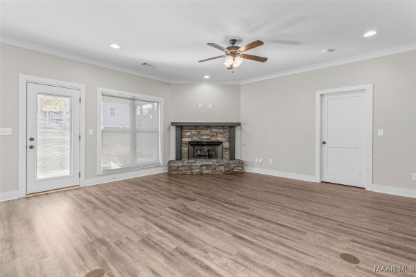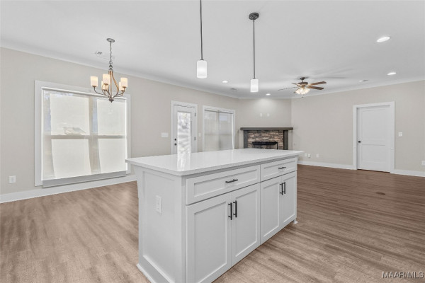 Down the hall, you’ll find a spacious laundry room with built-in cabinetry leading into the open living and kitchen area. The living space is warm and inviting, highlighted by a beautiful stone fireplace as the focal point. The kitchen overlooks the living room and boasts a HUGE island, custom cabinetry, and a large pantry — ideal for cooking and entertaining!