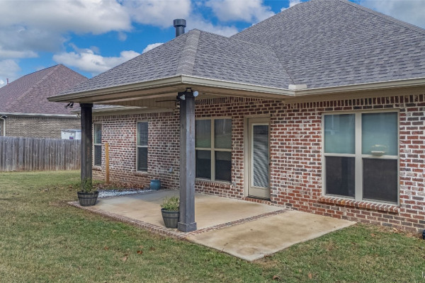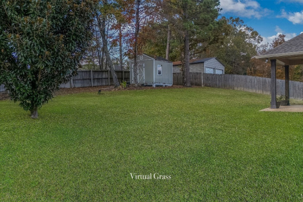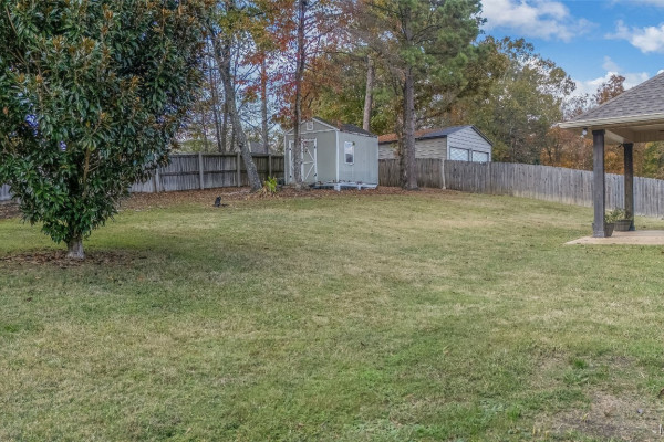 From the kitchen and living area, step out onto the covered back porch, perfect for grilling and relaxing. A large storage building remains with the property for added convenience.
