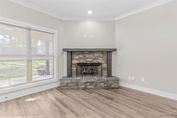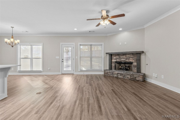 Down the hall, you’ll find a spacious laundry room with built-in cabinetry leading into the open living and kitchen area. The living space is warm and inviting, highlighted by a beautiful stone fireplace as the focal point. The kitchen overlooks the living room and boasts a HUGE island, custom cabinetry, and a large pantry — ideal for cooking and entertaining!