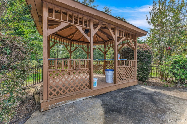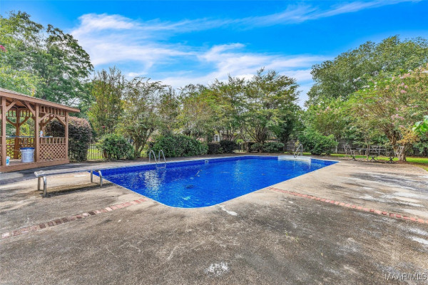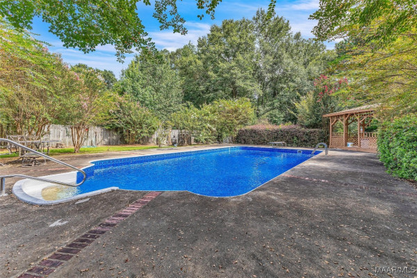 Custom home on a beautiful estate lot in the heart of Millbrook! 7.43 acres with Mill Creek running through the back of the property. The yard has mature hardwood trees, azaleas, magnolia trees, fig trees and even wild muscadines! The back 5 acres is wooded and perfect for hiking or rec trails. Sparkling inground pool has a new liner, the back porch is screened and the covered parking has attached storage. New roof on the house, gazebo and 1000 sf shop. The windows have been updated with newer energy efficient dbl pane glass and adorned with plantation shutters. This floorplan has 2 living areas, formal dining, 3 bedrooms/2.5 baths with over 3300 sf heated and cooled. Two new AC units. The master suite is enormous! It has a gas log fireplace, tray ceilings, 3 walk-in closets, jetted garden tub, dbl basin vanity and separate shower. There’s even a claw foot tub in the guest bath. Located on a tight knit cul-de-sac street barely 3 miles from I-65! Convenient to local schools, shopping, dining and only 15 miles from Maxwell AFB.