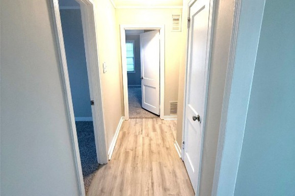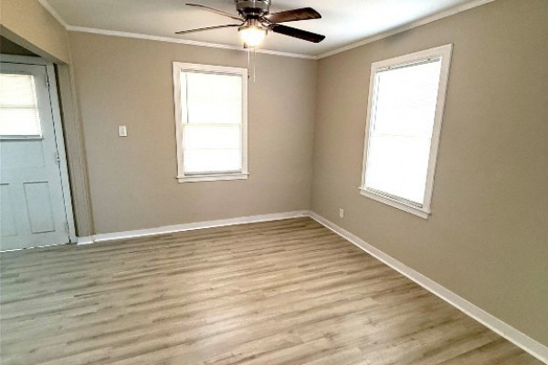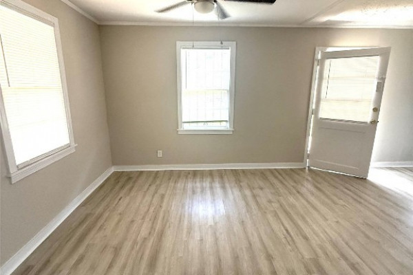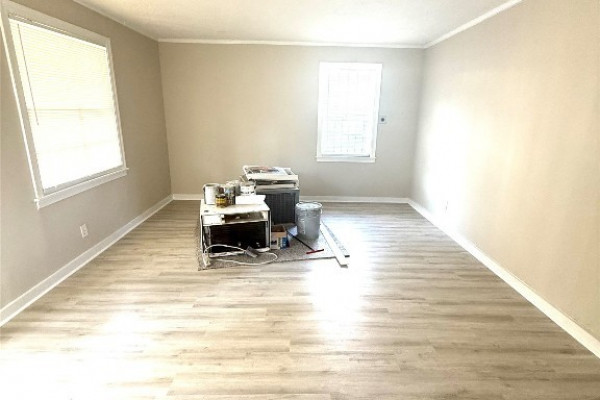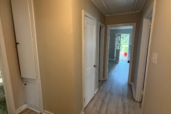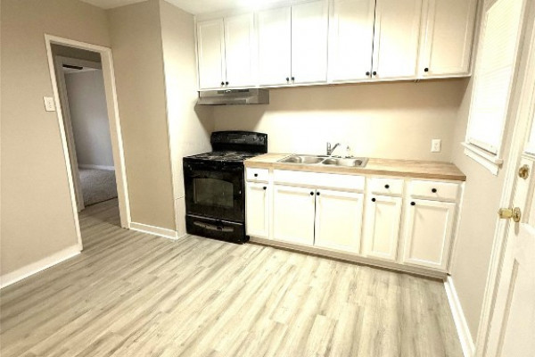 This charming 3-bedroom, 1-bath home has been fully remodeled inside and out, making it the perfect move-in-ready option. Updates include fresh paint, new flooring, new fixtures, and a bright, open layout that maximizes the space. The kitchen features a Cabinets, countertops, sink and hood vent.