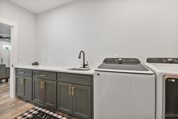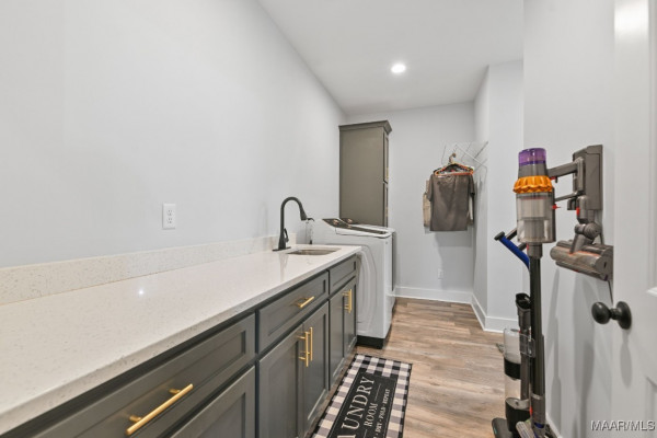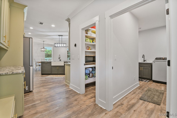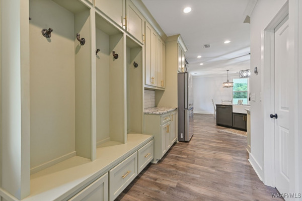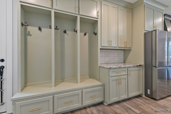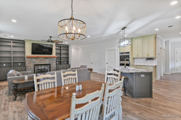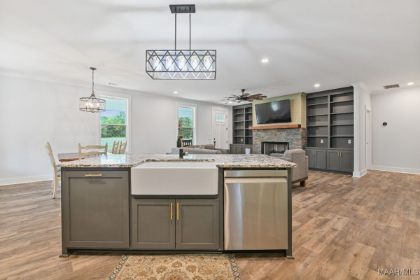 Step inside and be greeted by a spacious, open-concept family room with built-in cabinets, shelving, and a beautiful gas fireplace. The kitchen is both stylish and practical, featuring granite countertops, a tile backsplash, functional cabinet drawers, a farmhouse sink, double ovens, and a gas cooktop—perfect for everyday living and entertaining alike. Just off the kitchen, a built-in drop zone with cubbies leads to the laundry room, which offers a sink, counter space for folding, and access to a half bath and an oversized garage with epoxy flooring and a SECOND LAUNDRY HOOKUP.