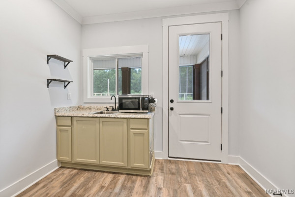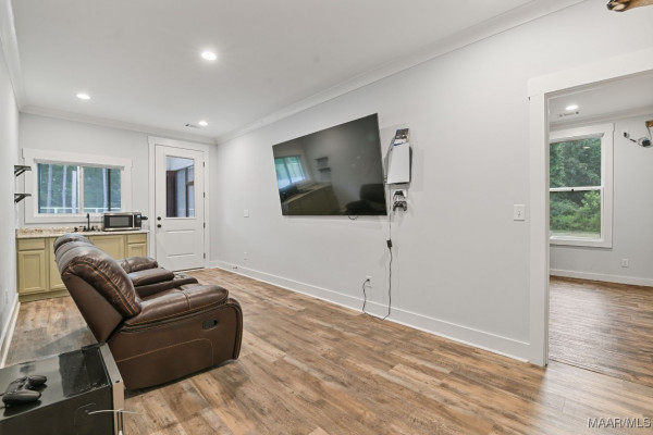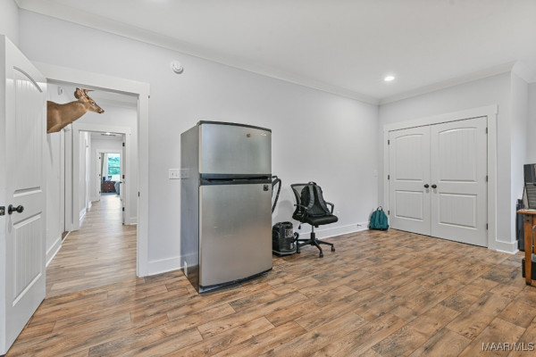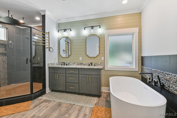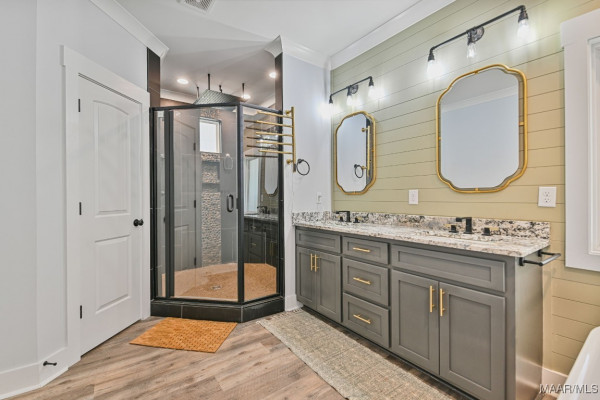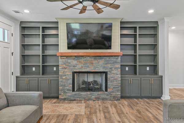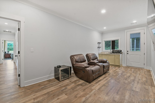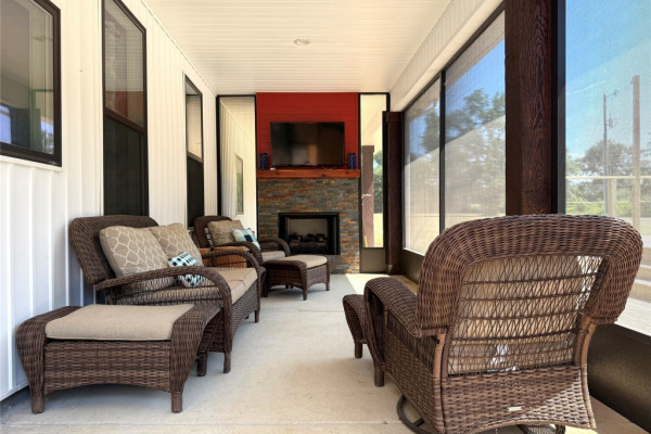 On the main level, the luxurious primary suite is a true retreat, featuring a spa-like bath with a soaker tub, double vanities, dual shower heads, and a HUGE rain head shower. The large walk-in closet connects to a reinforced SAFE ROOM, built to withstand tornados and equipped with the home’s security camera monitoring system. 2 additional bedrooms, a full bath, and a man cave with a wet bar, perfect for entertaining, complete the first floor and lead seamlessly to the screened-in porch.