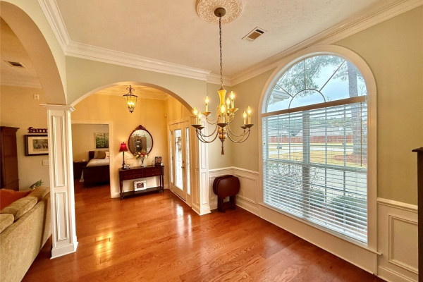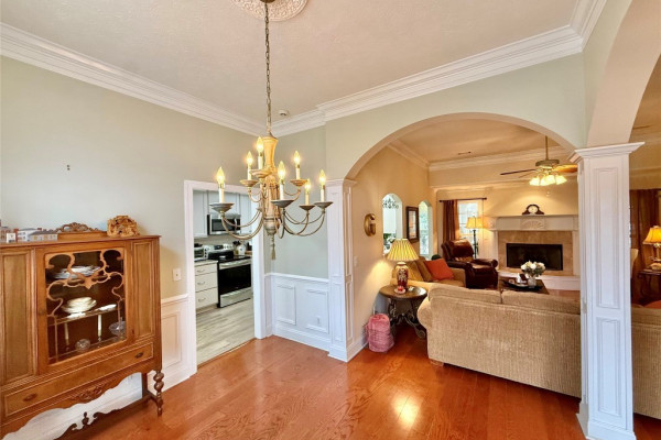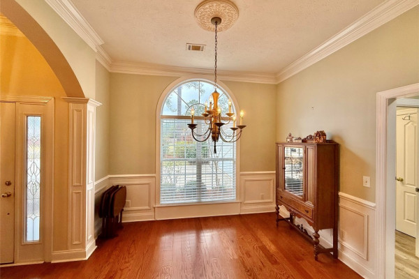 • Formal dining room with wood floors, wainscoting, and elegant moldings