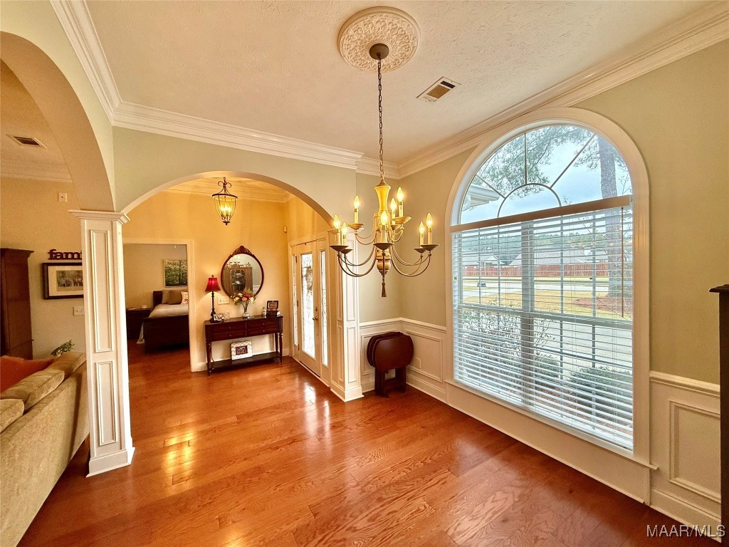 • Formal dining room with wood floors, wainscoting, and elegant moldings