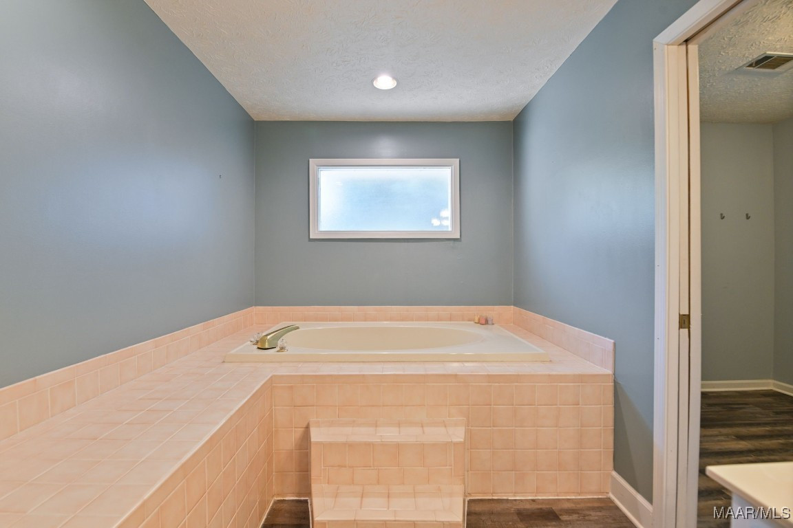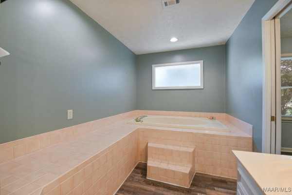 This home features four spacious bedrooms and 2.5 bathrooms, including a recently upgraded hall guest bathroom with a modern shower and a luxurious primary suite complete with a large soaking tub, a separate shower, a dressing area, and three closets, including a walk-in closet for ample storage.
