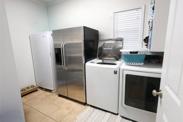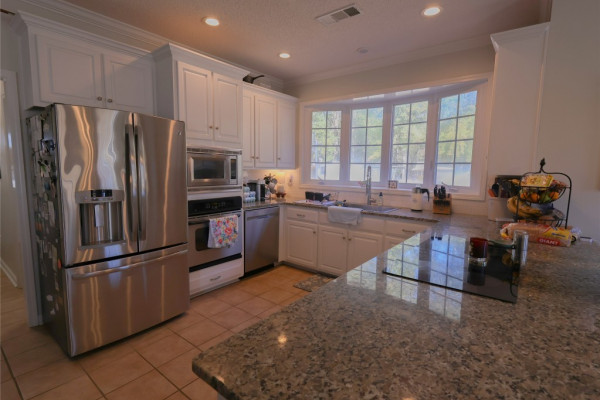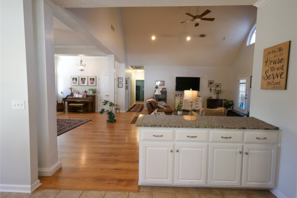 The large family room flows seamlessly into a gorgeous open kitchen featuring abundant cabinet space, an oversized breakfast bar, and an adjoining dining area with views of the property. The home also includes a generous utility room, great storage throughout, and a carport for convenient parking.