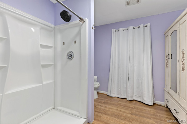 The huge primary suite features a large attached bath with walk-in tile shower, vanity, and a massive walk-in closet with an integrated laundry room for convenience.