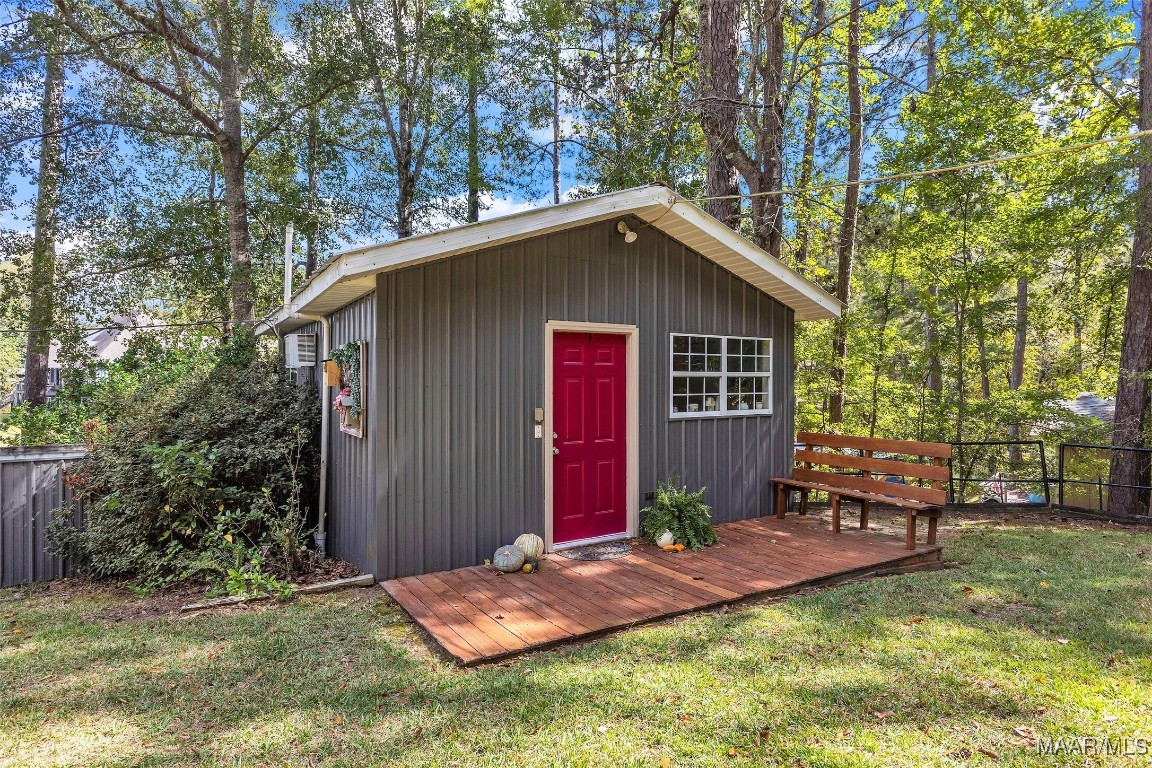 A separate studio apartment with kitchenette and private deck overlooks the water — great for guests or potential rental income. On the opposite side, another private deck leads to a personal retreat that could be used as a hobby studio, man cave, or quiet getaway.