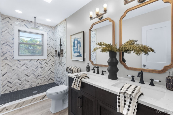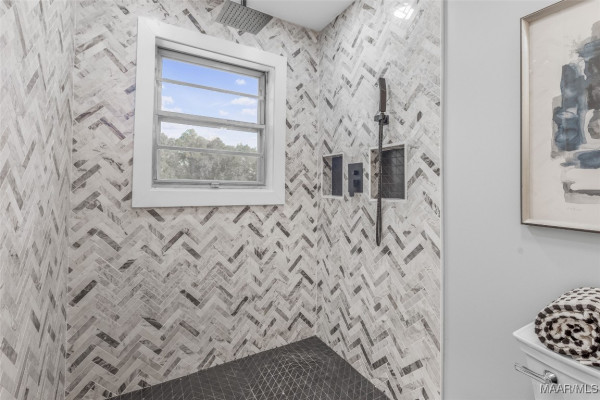 The downstairs level is an entertainer’s paradise! A large gathering room opens directly to the backyard and pool area, perfect for hosting. Off this secondary living space, you’ll find an office, storage area, and laundry room. Near the staircase, a second full bath showcases a large vanity and a tile shower with a rainhead.