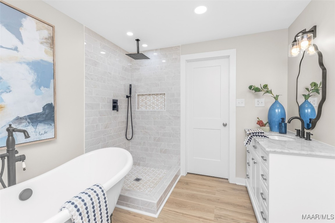 The primary suite is tucked away for privacy and features plenty of space for a king set, along with a luxurious ensuite boasting double vanities, a custom tile shower, freestanding soaking tub, and a massive walk-in closet.