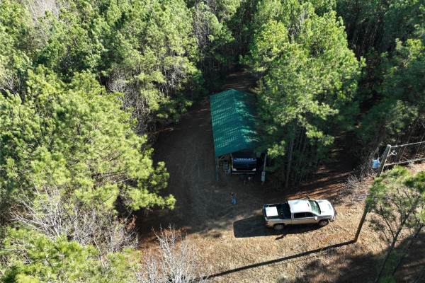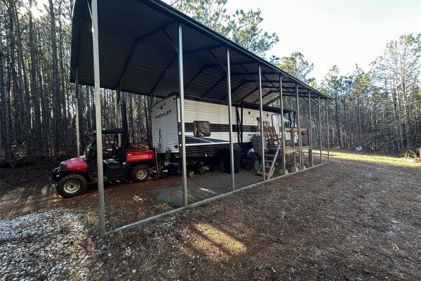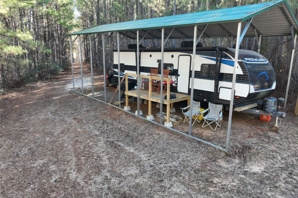 A 2020 Prowler camper, located under a covered shed, is included and provides a comfortable and convenient base for weekends at the camp, extended stays during hunting season, or while building your dream home or hunting cabin. This setup allows you to enjoy the property while planning for future improvements immediately.